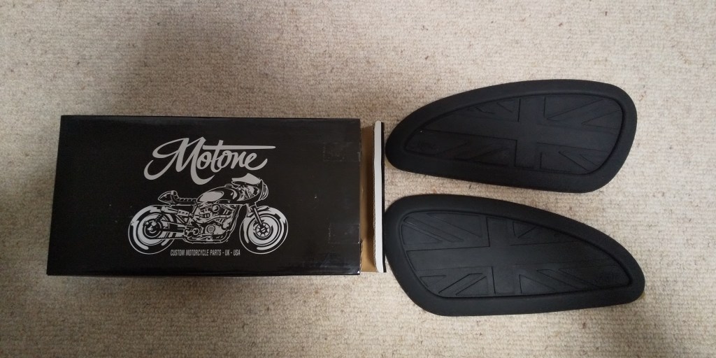 ニーガードはいま販売していないようだし、ベンチシートは高価なので、まずはタンクパッドで対策してみることにしました。Street Twin用のタンクパッドは、いろいろなメーカーから販売され輸入されているのですが、どれも結構なお値段です。ちょうどMotoneのタンクパッドを1万円以内で見つけたので、購入することにしました。日本国内に在庫があったこともあり、すぐに入手できました。