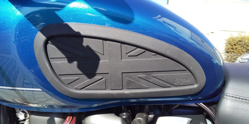 タンクパッドを使用した印象ですが、もともとタンクの下側に膝がひっかかる程度であったのですが、それでもタンクパッドの厚みの分だけタンク部分の幅が増えたことにより、少しニーグリップがしやすくなったように思います。左右で2㎝くらいタンクの幅が増えた程度ですが、それでも効果はあるようです。ニーグリップが改善された一方、ユニオンジャックのタンクパッドがタンク上に加わったことで、Street Twinの外観がさらにかっこよくなりました。総合的にとても満足しています。