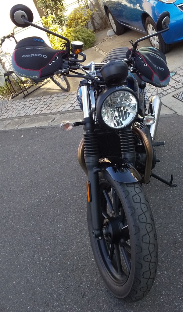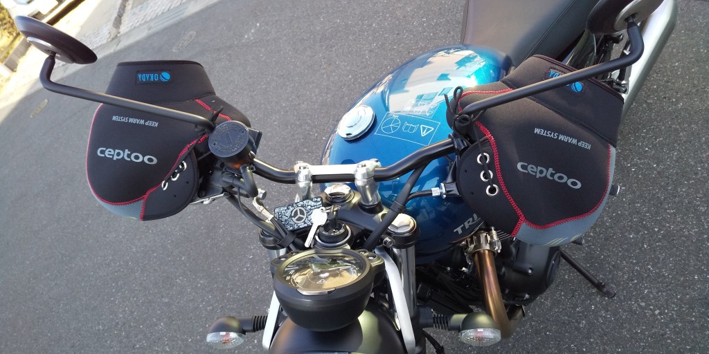 Street Twinに取り付けた感じは画像の通りです。Neo Retroと言われるStreet Twinには結構似合うのではないでしょうか。170㎞くらいのツーリングに使用してみましたが、高速道路の走行中も含めて寒く感じることはありませんでした。ハンドルカバーの中で使用したグローブは、春秋用の薄手の皮のものです。厚手のグローブが不要なので、手もとても楽です。