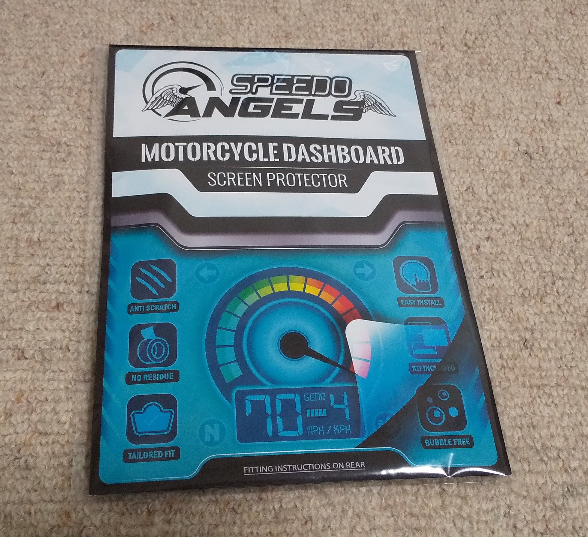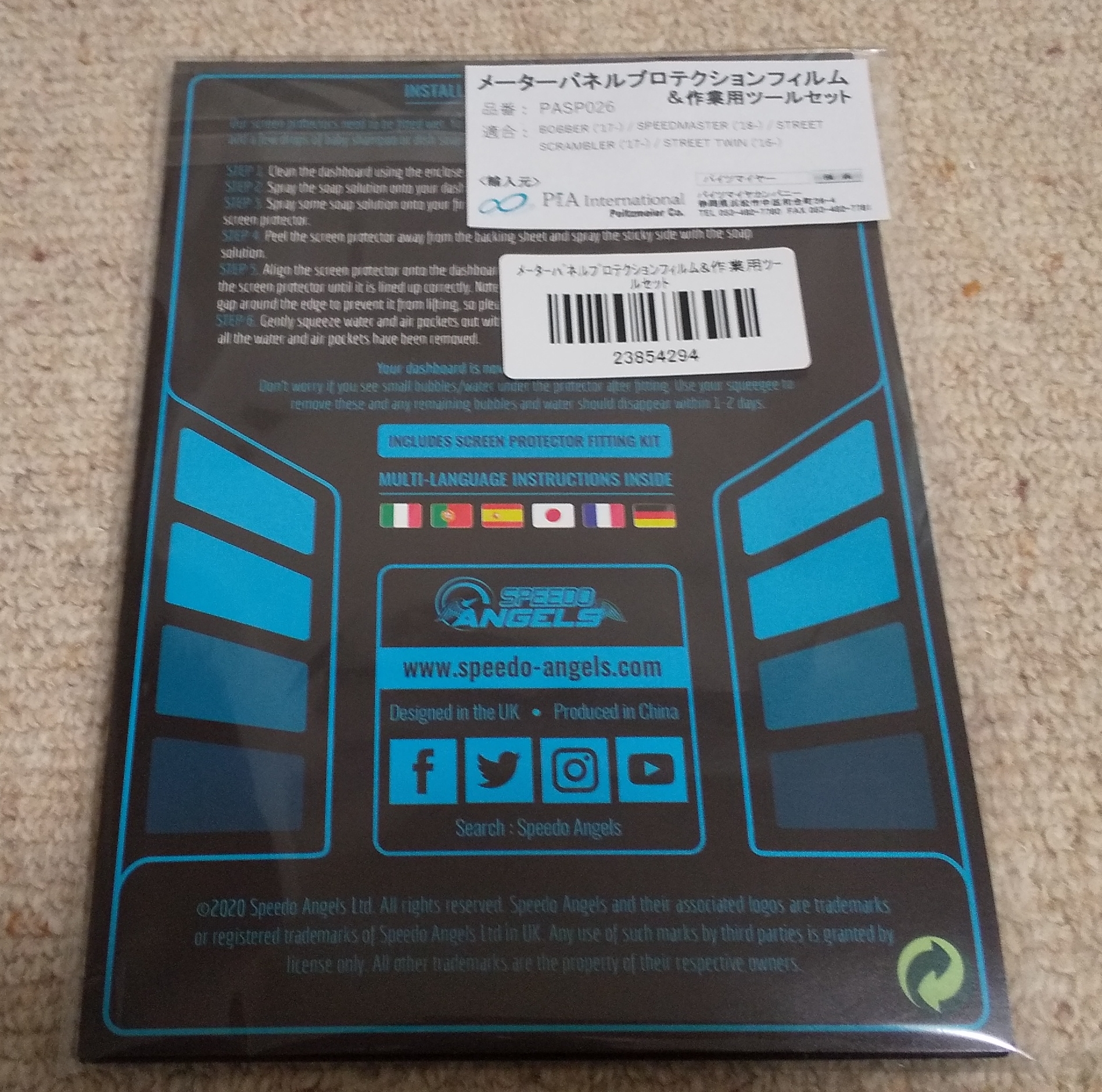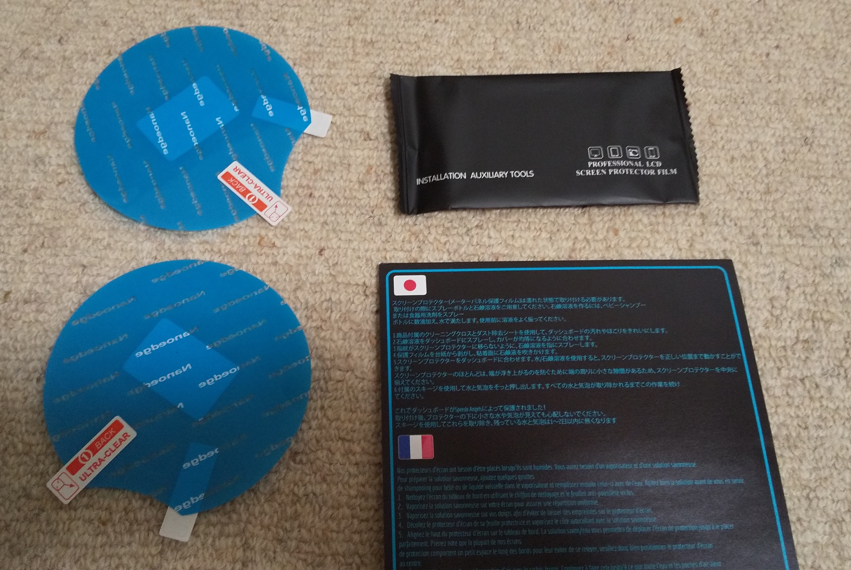 プロテクションフィルムが2枚とメーターパネルを清掃するためのウェットシート、クロス、Dust-absorber、気泡を除去するためのスキージが入っています。プロテクションフィルムのサイズは冒頭の画像のように、Street Twinのメーターパネルにピッタリでした。