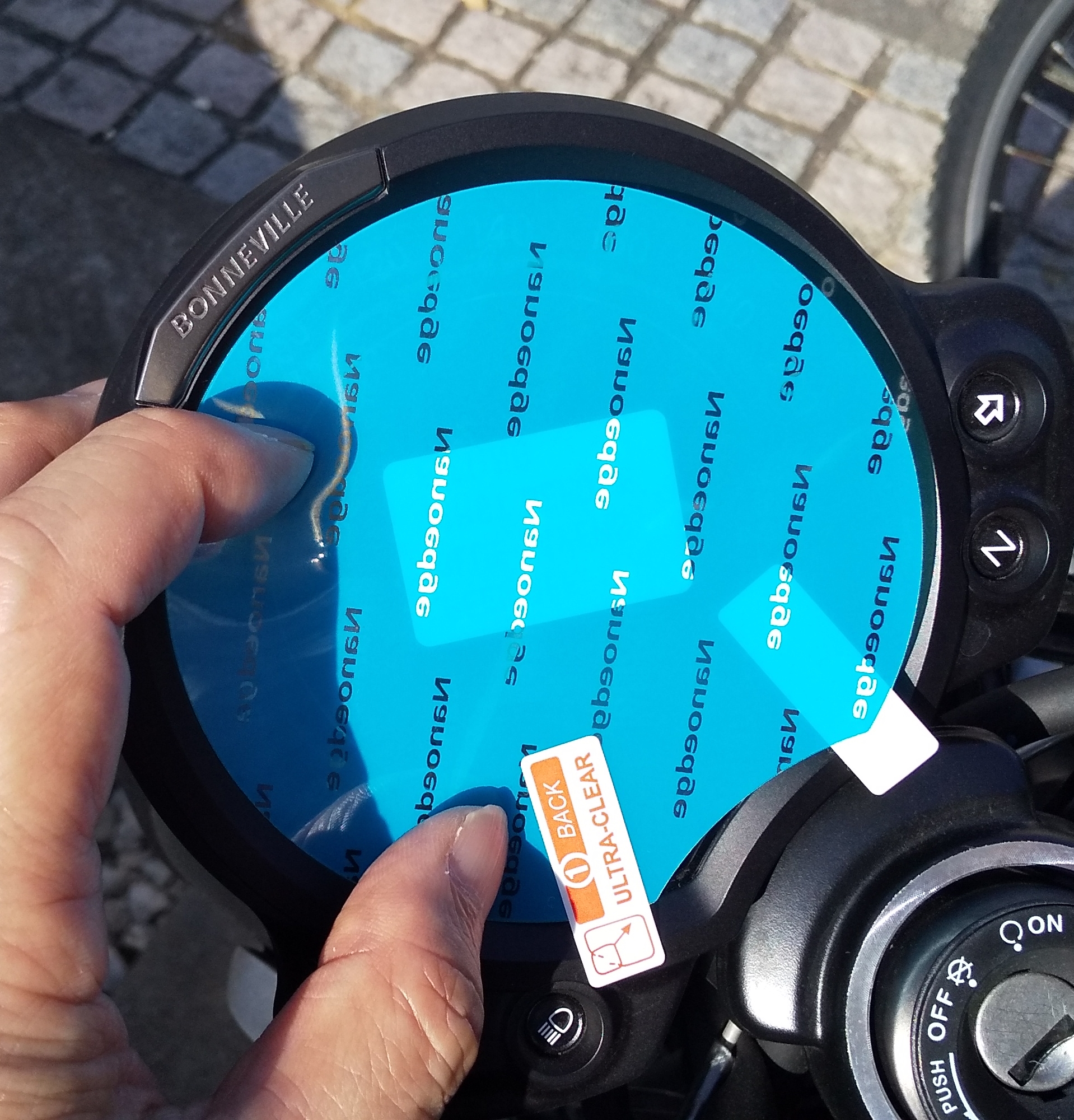 スマートフォンの表面に傷がつかないようにフィルムを貼ると思います。Street Twinのメーターパネルにも、同様にプロテクションフィルムを貼りました。