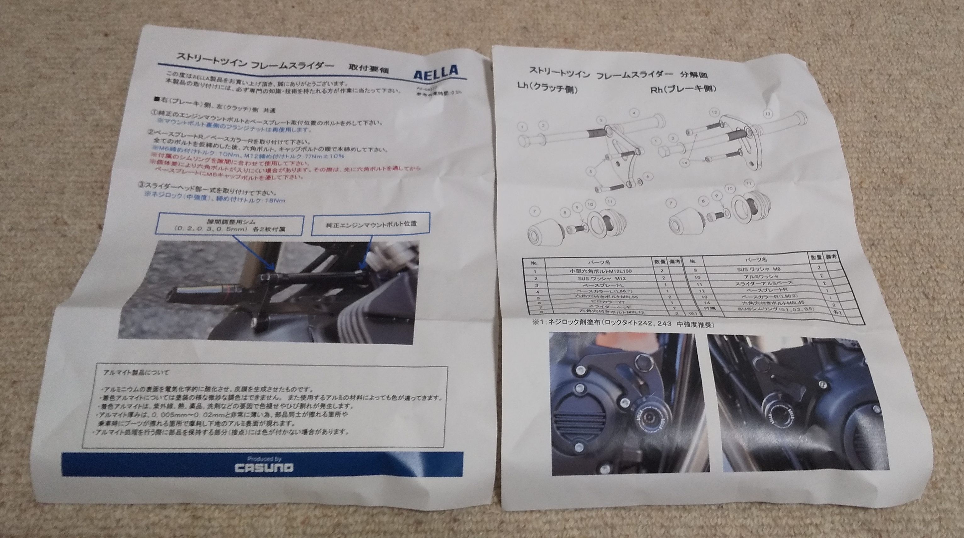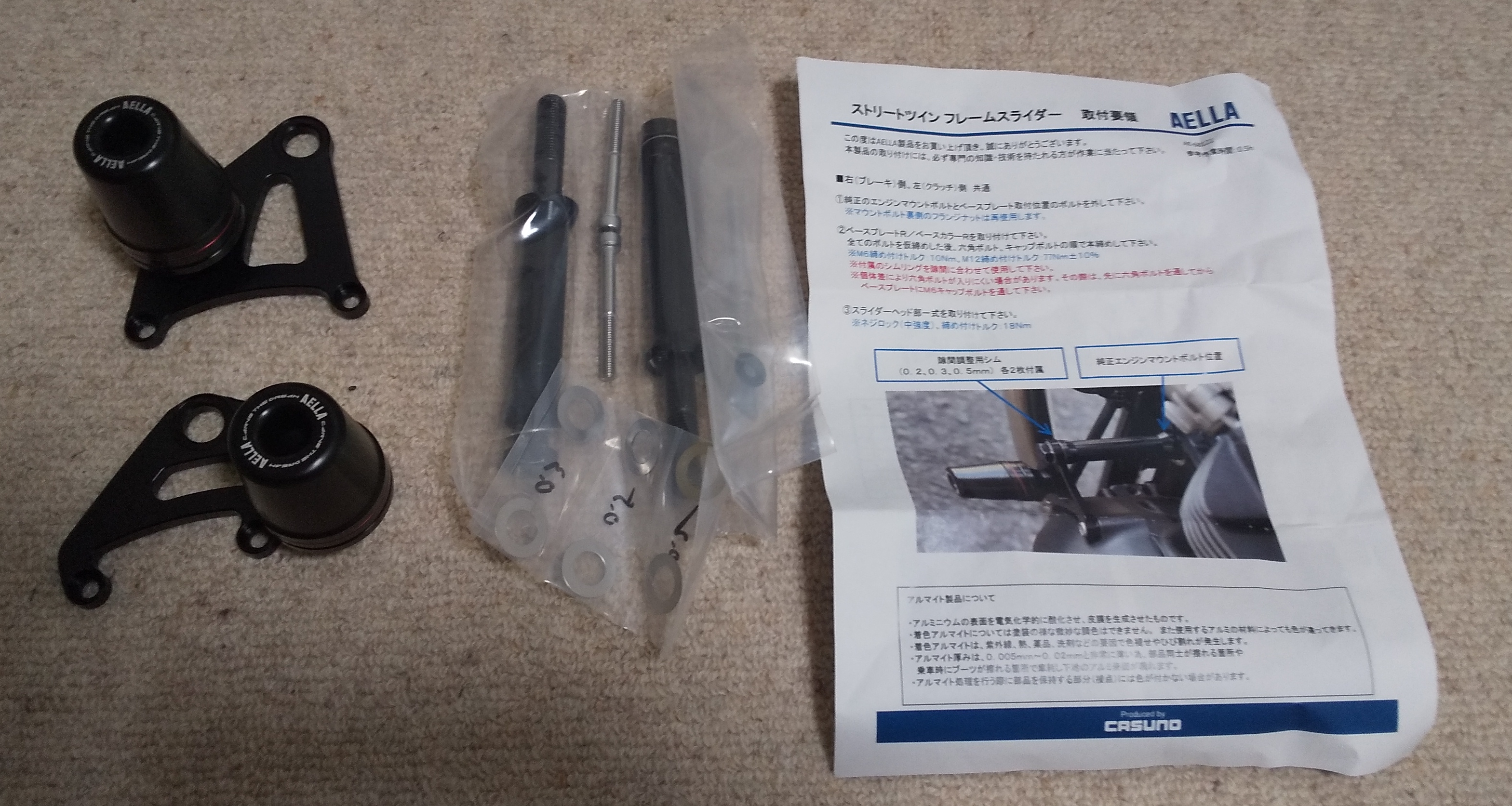 転倒時のフレーム保護を目的に、Street Twinのフレームスライダーを買いました。2021年12月にネットで発注したのですが、輸入の為、手元に届いたのは2022年3月中旬でした。結構時間がかかるものなのだと感じました。