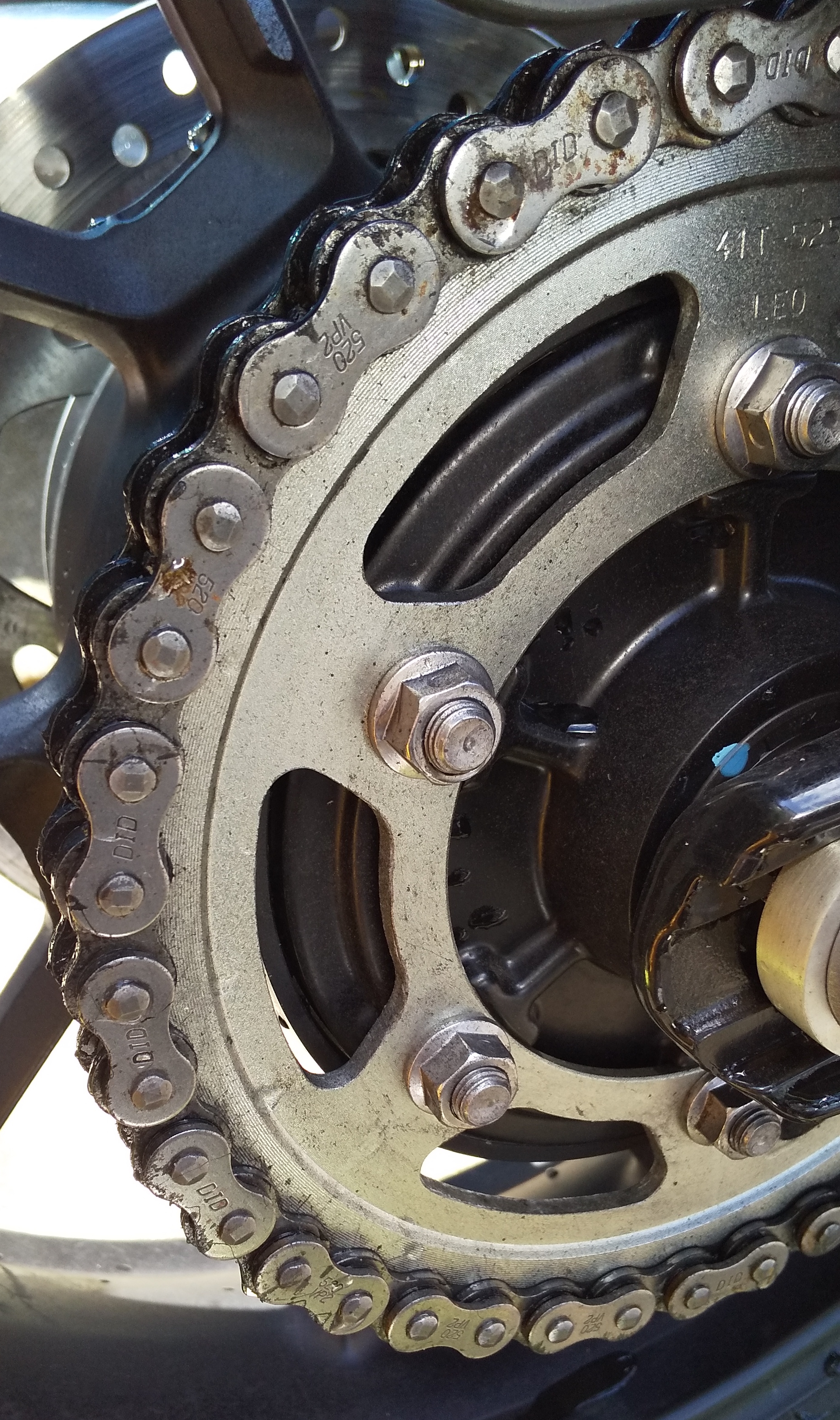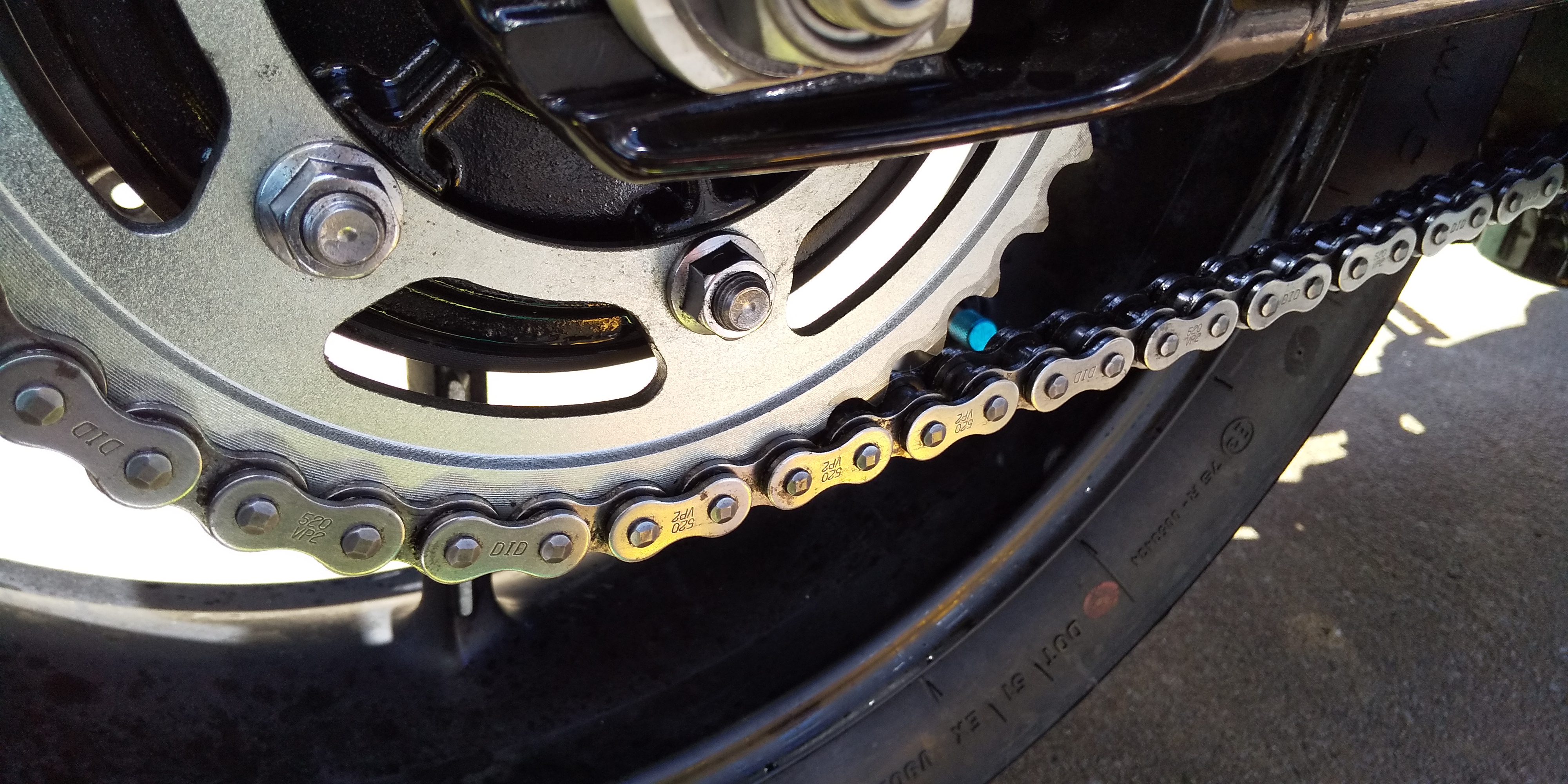 Street Twinのチェーンを見ると、やはり汚れています。チェーンクリーナーを吹き付けて、ブラシでゴシゴシしてきれいにします。チェーンルブを吹き付けて約15分待ち、余分なルブを拭き取って完了です。Street Twinのチェーンを3回転させて作業しました。やはりきれいなチェーンは気持ちいいです。
