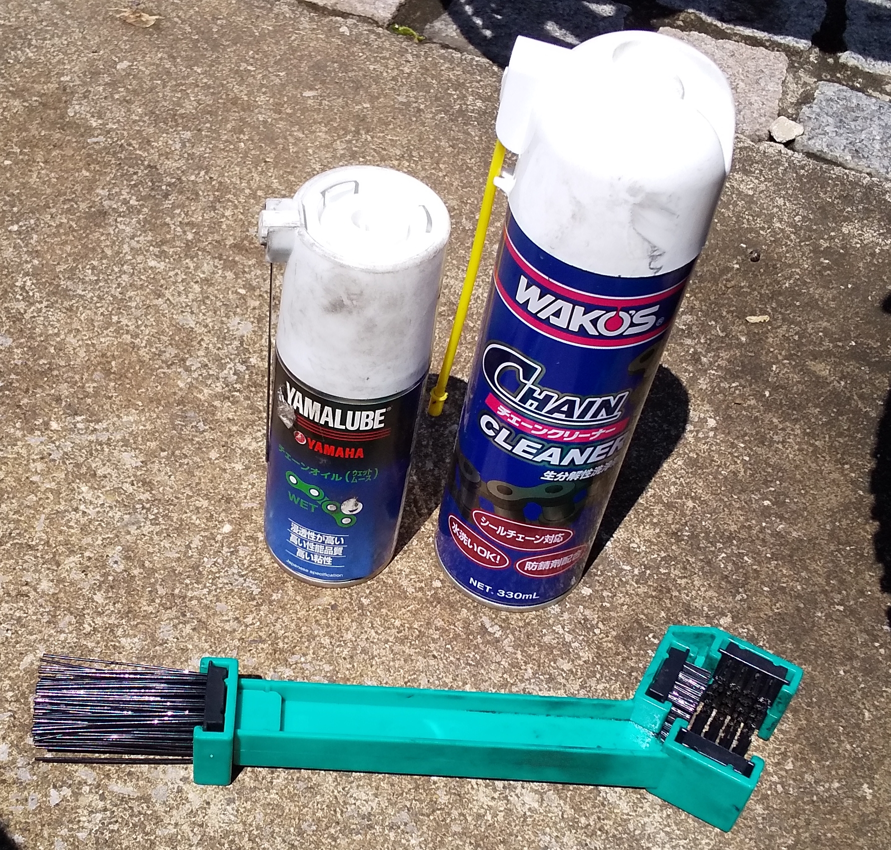いつものようにStreet Twinの後輪をメンテナンスローラーに載せ、前輪を軽くロックして実施しました。使用したのは画像の3点です。これで5回目のチェーンメンテナンスですが、いずれも同じです。そろそろなにか工夫をしようか模索中です。メンテナンスローラーにもすっかり慣れた感じです。