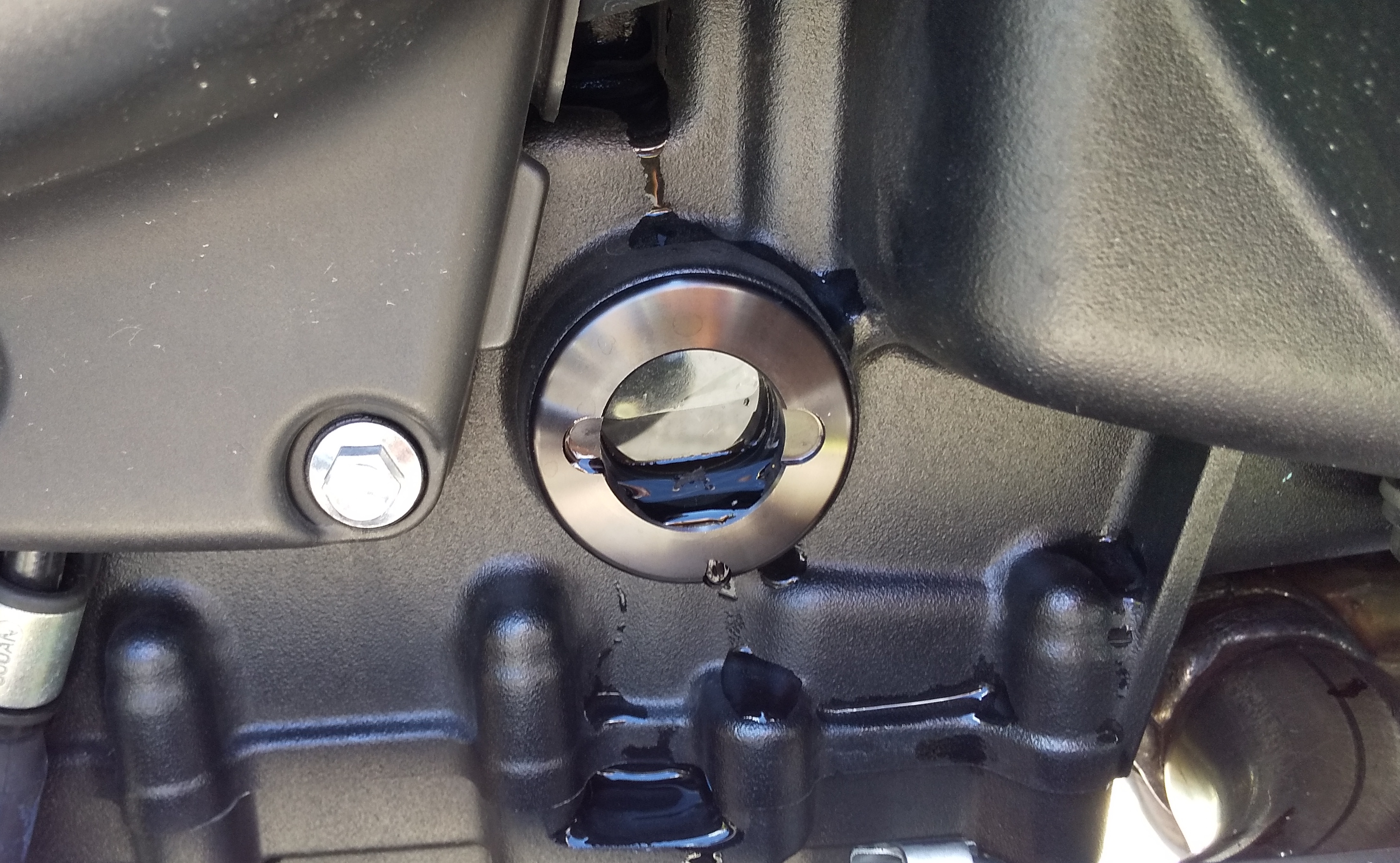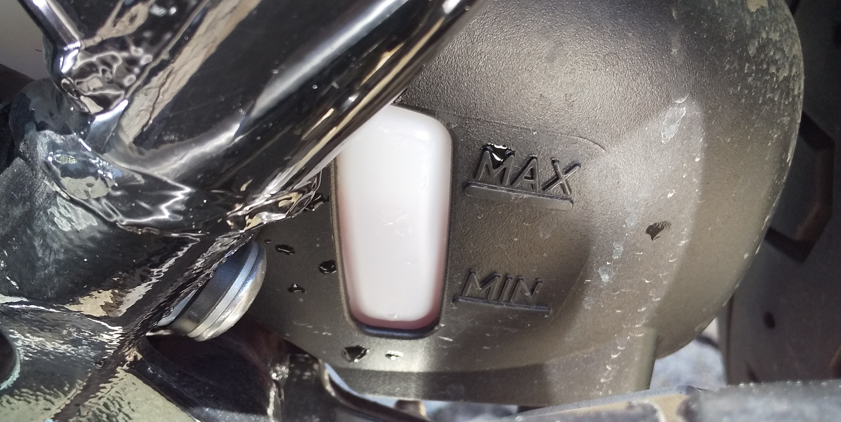 最後にフロントホイールクランプでStreet Twinの車体を立て、エンジンオイルと冷却水の量をチェックします。どちらもMaxに近いところにあるようなので、大丈夫のようです。