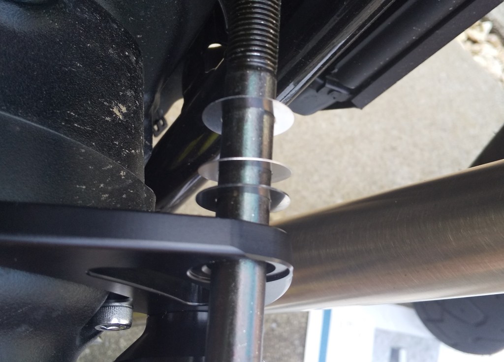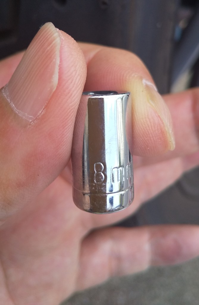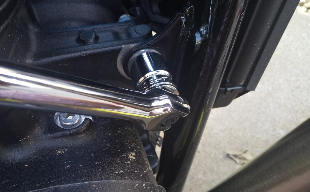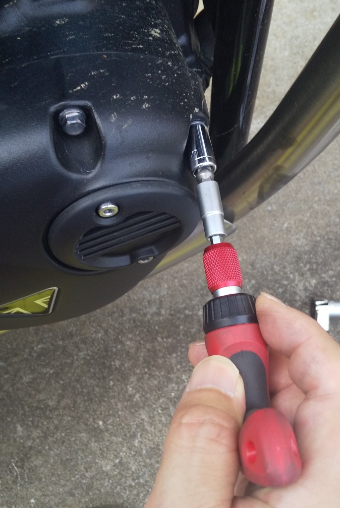先日購入したスピンナーハンドルが活躍しました。見た目が少し細かったので不安でしたが、楽にボルトを緩めることができました。スピンナーハンドルで1本、ドライバーで2本緩めることで、片側のボルトを外すことができます。