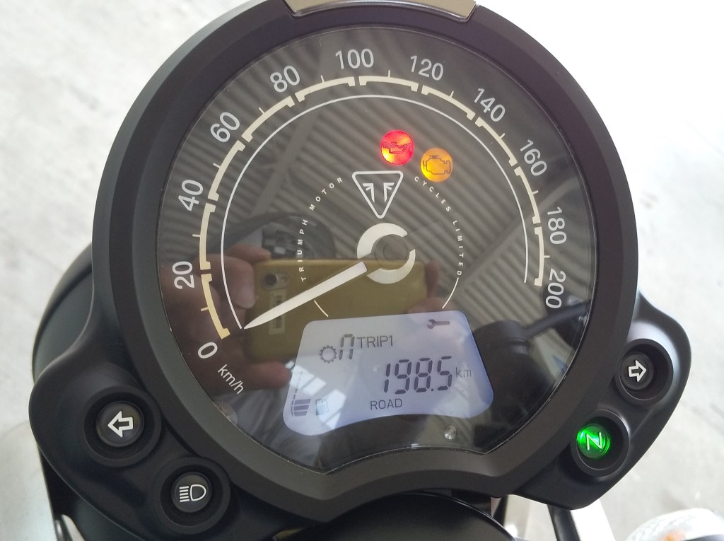 私がStreet Twinで出かけるときは、定番のコースがあって、沼を一般道で一周する約36㎞です。信号と交通量が少ない道を選んでいるので、信号は15個くらいと思います。一般道ですから、使うギアは3速と4速が多くなります。5速は時々使う程度です。その積み重ねで画像のように198.5㎞走りました。