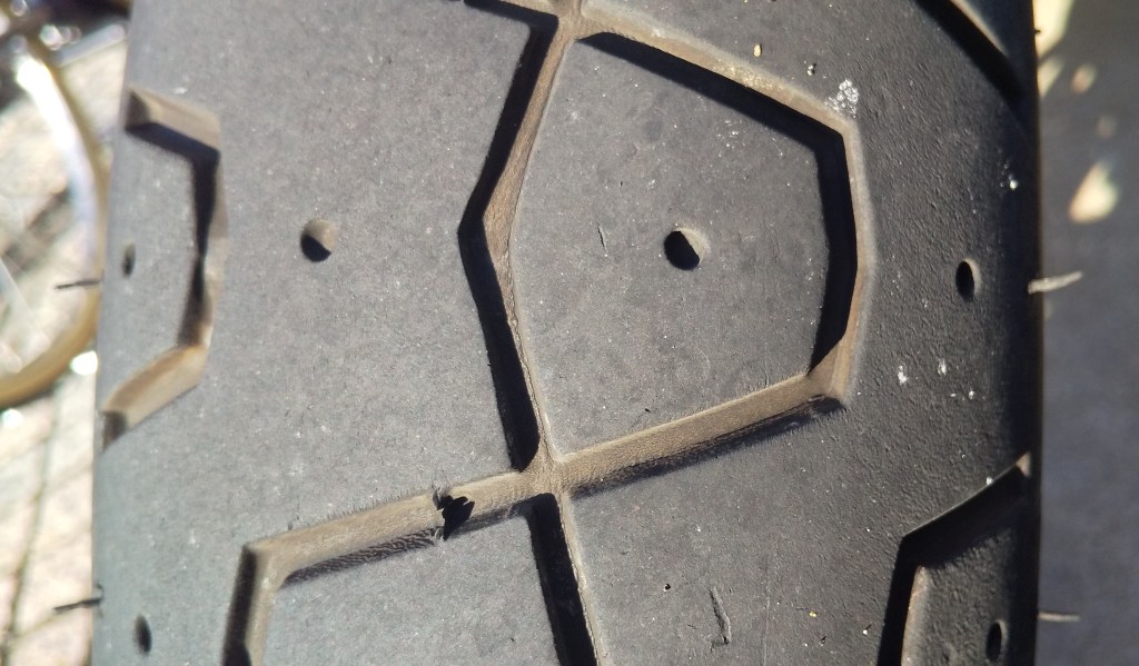 Street Twinの前後タイヤに釘などの異常はありませんでした。前輪の溝は浅くなりつつあるようです。後輪の溝は深いです。Depth Gaugeを使いませんでしたが、少しずつ溝が浅くなっているようです。