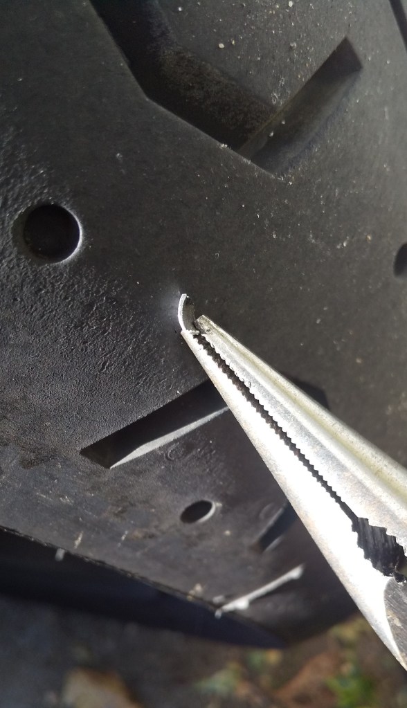 恐る恐る抜いてみると、大きさ2~3ミリ程度の鉄の破片みたいでした。釘のようなものが深く刺さっているのではなくて、よかったです。まだまだ溝がたくさんあるのに交換することになったらタイヤがもったいない…とセコイことを考えてしまいました。