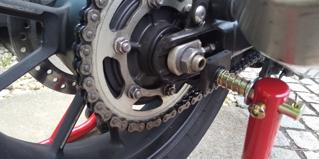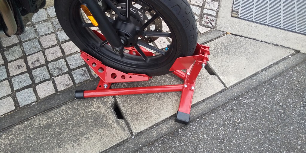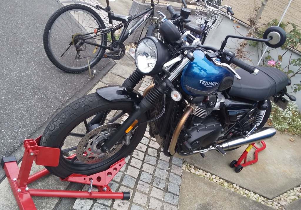 バイクはスタンドをかけた状態だと左側に傾きます。Street Twinはバイクの右側にチェーンがあるので、チェーンクリーナーやチェーンルブが垂れるとホイールやタイヤに付いてしまいます。でも、メンテナンススタンドで車体を立てると、垂れてもホイールやタイヤに付きません。そのため、フロントホイールクランプやメンテナンススタンドを重宝しています。