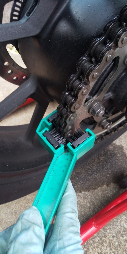 Street Twinの前回のチェーンメンテナンスから約500㎞走りましたので、チェーンメンテナンスを実施しました。いつものようにフロントホイールクランプとメンテナンススタンドを使って安全に垂直にします。これまで使っていたチェーンクリーナーが空になったので、今回から買っておいた呉工業製を使いました。