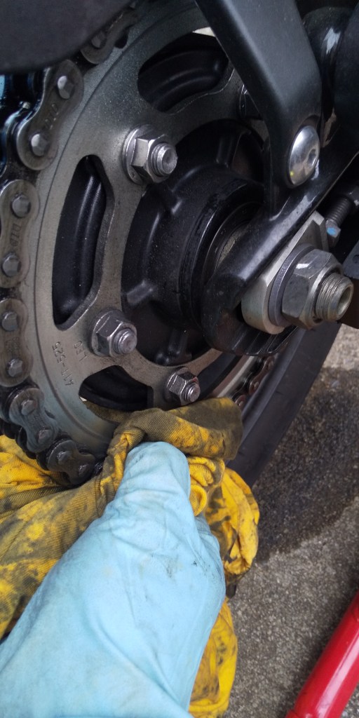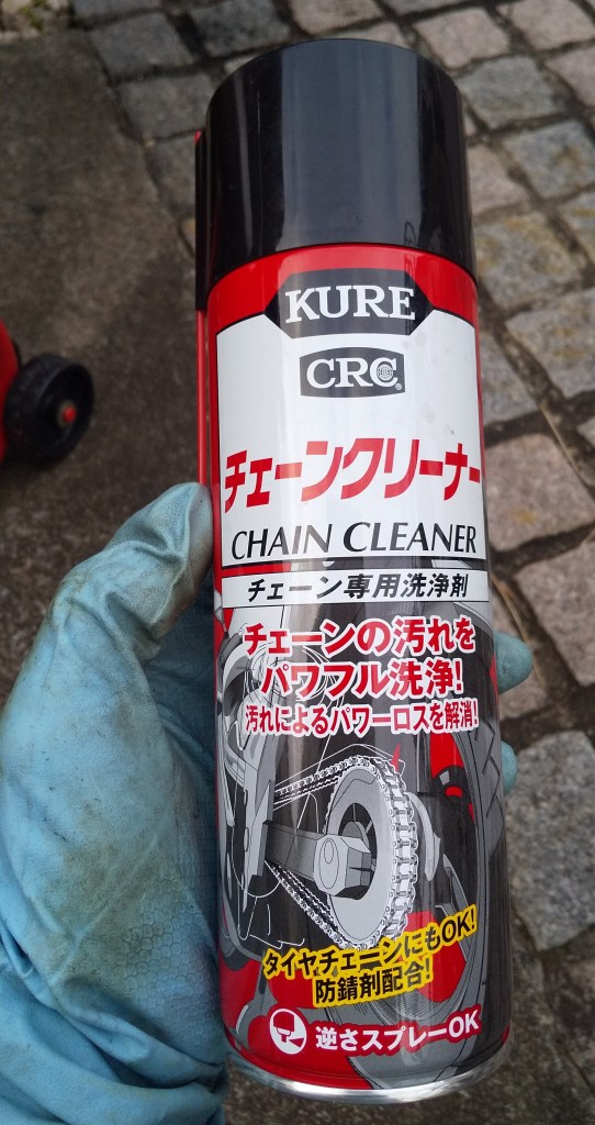 チェーンにクリーナーを吹き付け、ブラシを軽くかけて汚れを掻き出し、ウエスで拭き取ります。チェーンルブを吹き付け、15分経ったらウエスで余分なルブを軽く拭き取って終了です。メンテナンスのあとはいつも気持ちいいです。