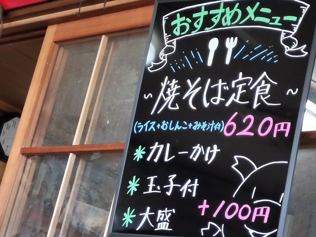 Googleでチェックすると、焼きそば定食がおすすめのようでした。でも私には量が多そうなので、単品の焼きそばにしました。注文したのは、焼きそば(400円)+たまご(100円)+カレー(100円)です。シンプルに焼きそばとたまごだけでもよかったのですが、美味しそうな気がしたのでカレーをかけてもらいました。