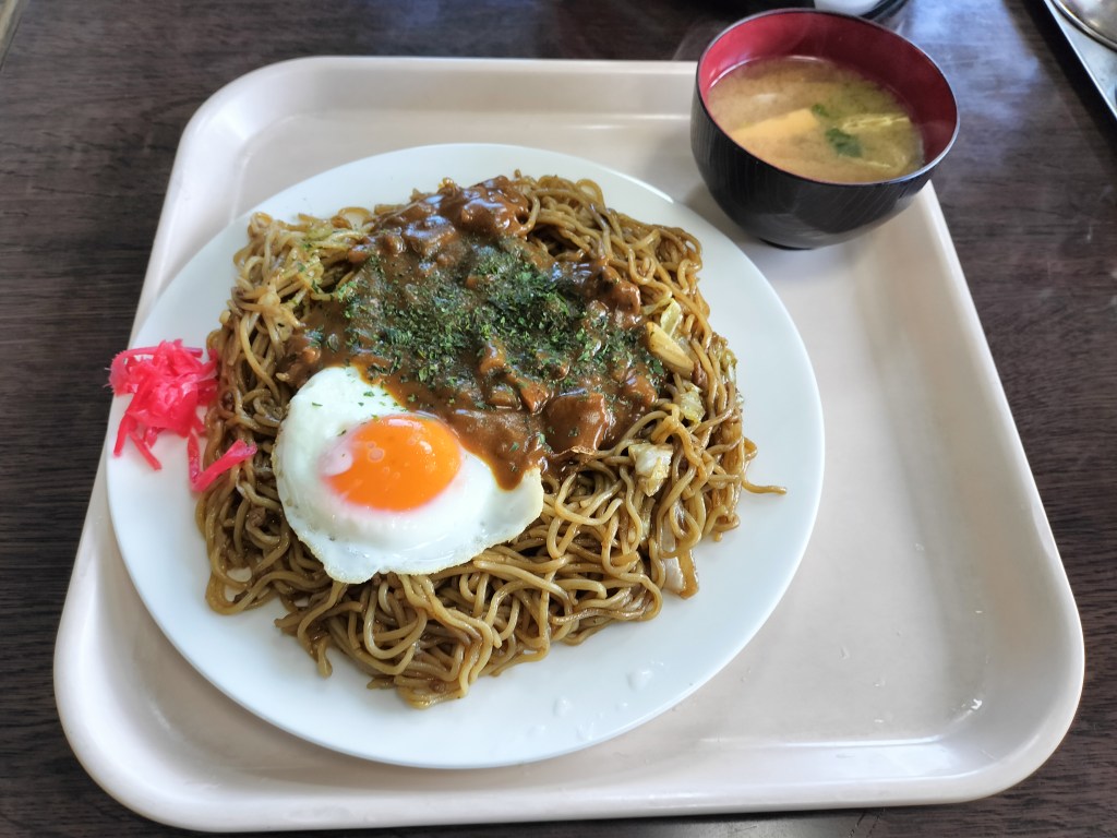店内は昔ながらの定食屋という感じで、落ち着いて食べることができました。地元の人に愛されている感じがします。単品の注文ですが、みそ汁もついてきました。焼きそばにカレーをかけて食べるのは初めてでしたが、とても美味しかったです。なかなかいい組み合わせでした。