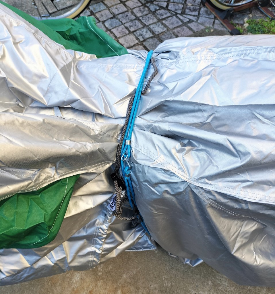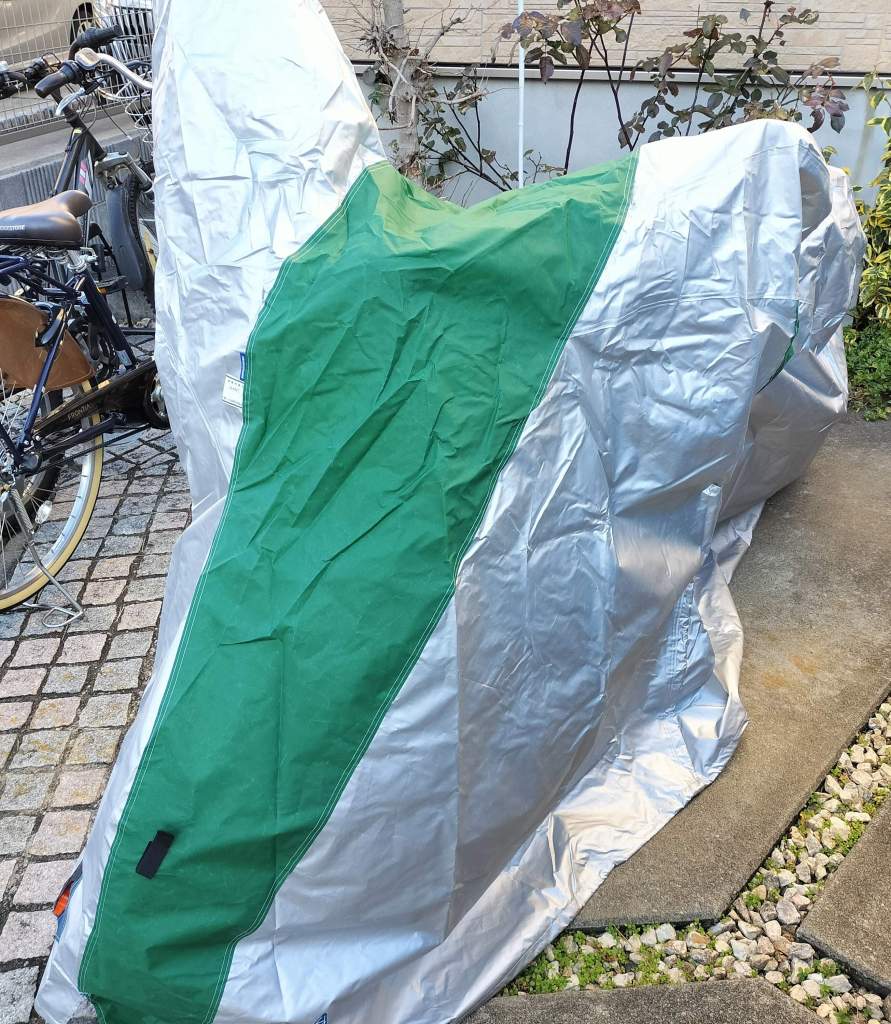バイクカバーをかけると画像のようになります。前と後ろに紐があり、キュッと絞ることができます。