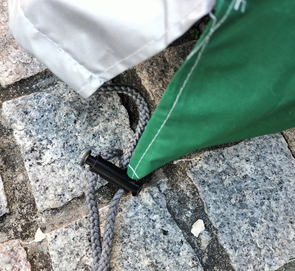 中央にも紐があって絞ることができるようになっています。でもあまり強く絞ることができないので、風で飛んでいってしまったことがあります。いまは自転車の荷台などに使用するロープで絞っています。ロープは100円ショップで買っています。こうすることで、風が吹いても外れて飛んでいってしまうことがなくなりました。台風が来てもいまのところ大丈夫です。