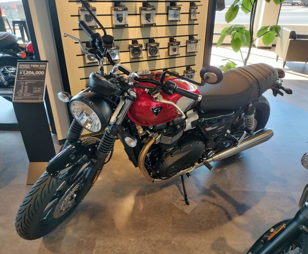 これがSpeed Twin 900です。RED HOPPERという色です。2023年モデルからStreet TwinからSpeed Twinという名前に変わったそうです。スペック的には大きな変更はなさそうですが、タイヤがPirelliから変更になっているようです。銘柄を見るのを忘れてしまいましたが、パターンをWebで確認するとMichelinぽいですね。このパターンもカッコイイ。