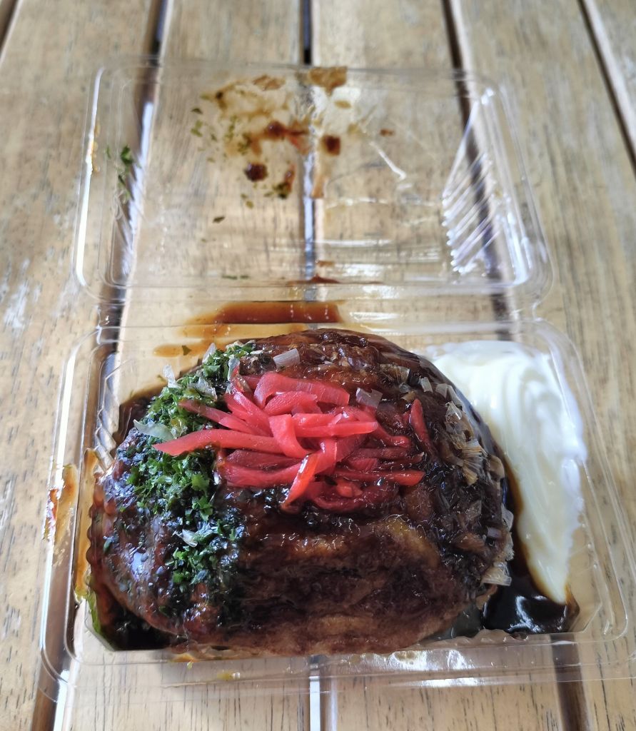 入口付近にはお土産物を買うことのできるお店が並んでいます。少し小腹が減ったので、バクダン焼きというものを食べることにしました。500円でしたが、結構大きいです。たこ焼きとお好み焼きを足して二で割ったようなもののようでした。簡単な食事を摂るための休憩スペースもありましたので、そこで食べました。美味しかったです。