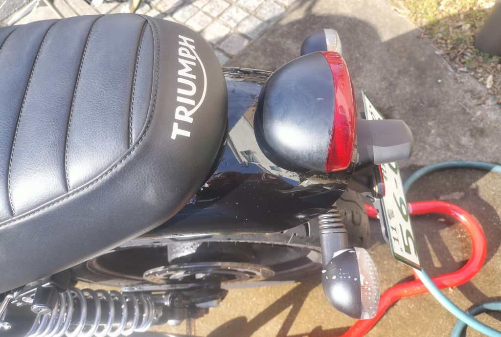 シャンプーやクリーナー、クリームクレンザーをきれいに水で洗い流し、水分をマイクロファイバーなどできれいに拭き取ります。汚れが落ちてStreet Twinがきれいになりました。とても気持ちいいです。
