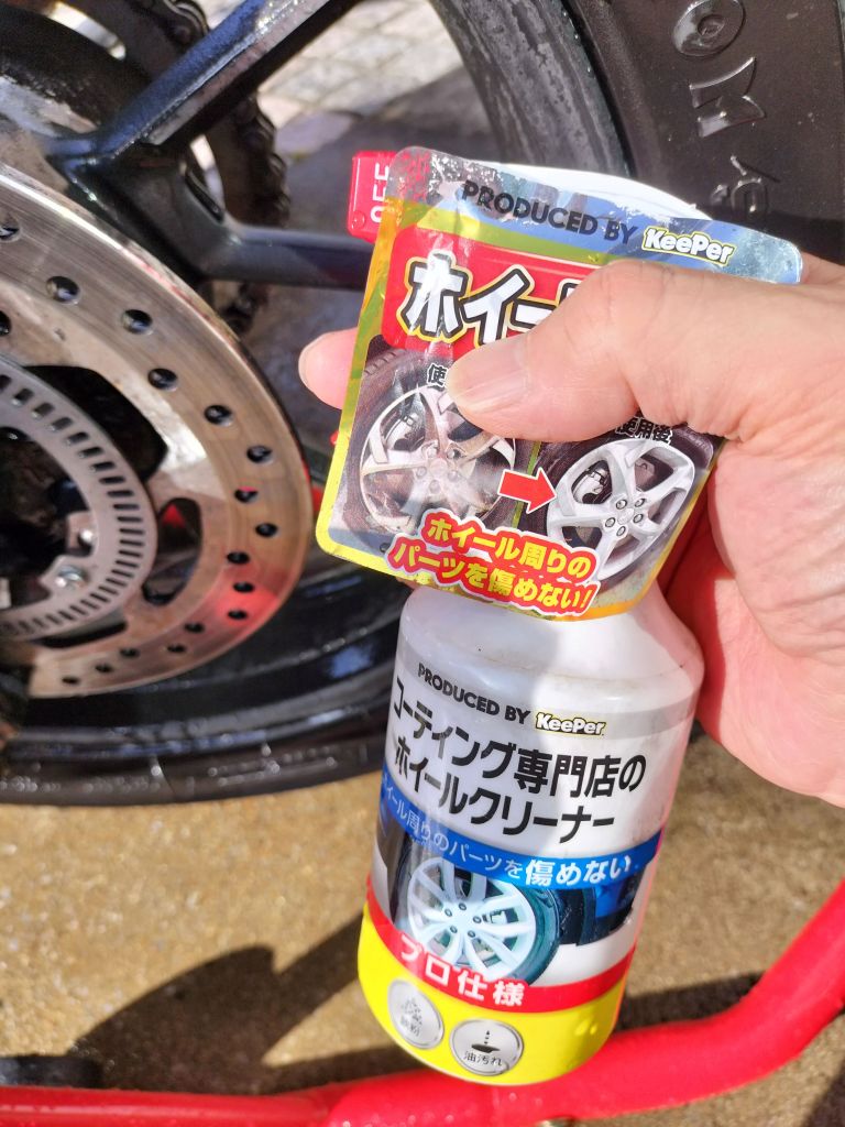 ホイールにはKeeperコーティング用のクリーナーを使用しています。あまり泡立つ方ではないのですが、油汚れを取り除くことはできているようです。吹き付けたら15秒ほど待ち、スポンジで汚れを落とします。今回の洗車で1本使い切ってしまったので、補充しようと思います。