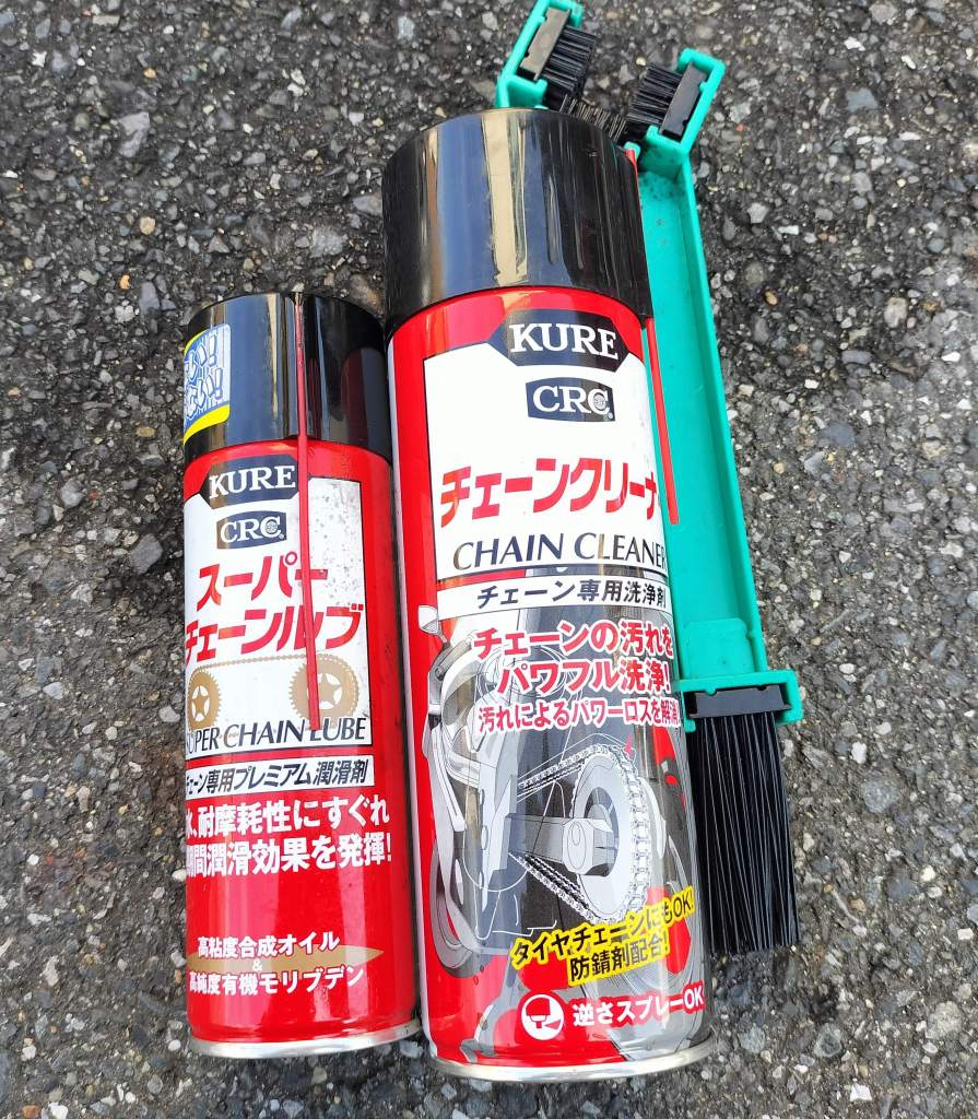 呉工業のチェーンクリーナーとチェーンルブ、そしてブラシを使用しました。