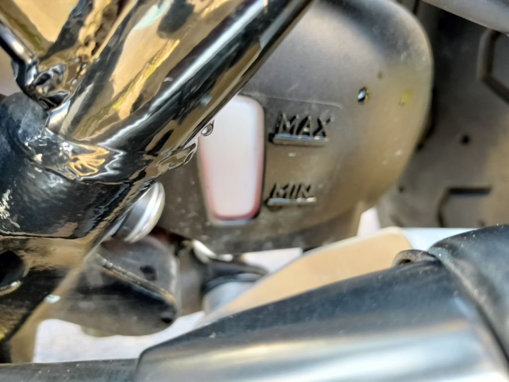 フロントホイールクランプとメンテナンススタンドで車体を立てているので、ついでにオイルと冷却水もチェックしました。どちらもゲージのMax近くにあるようです。Street Twinはあまり手のかからないモデルのようですね。