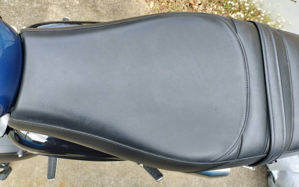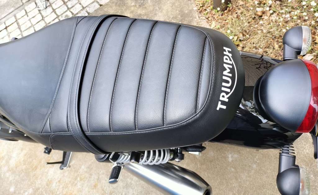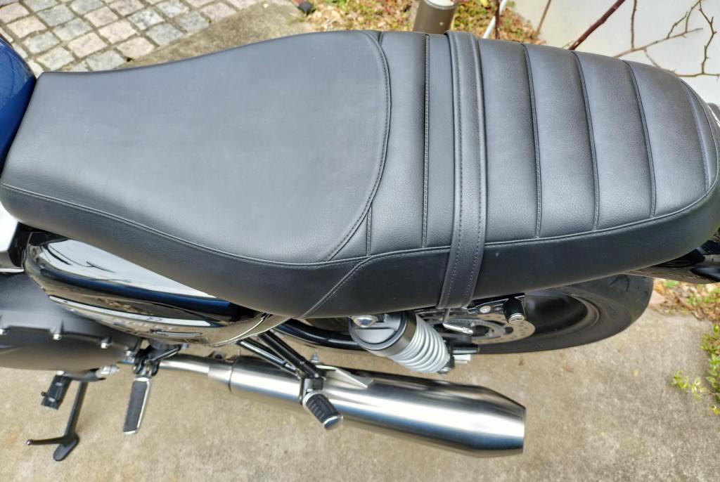 Street Twinのシートをクイッククロスで拭き掃除をしてから2週間くらい経ったときの画像です。拭いたばかりの時は、まだ白っぽい汚れが残っているように見えたのですが、成分が浸透したのかシートの色が落ち着いた感じがします。