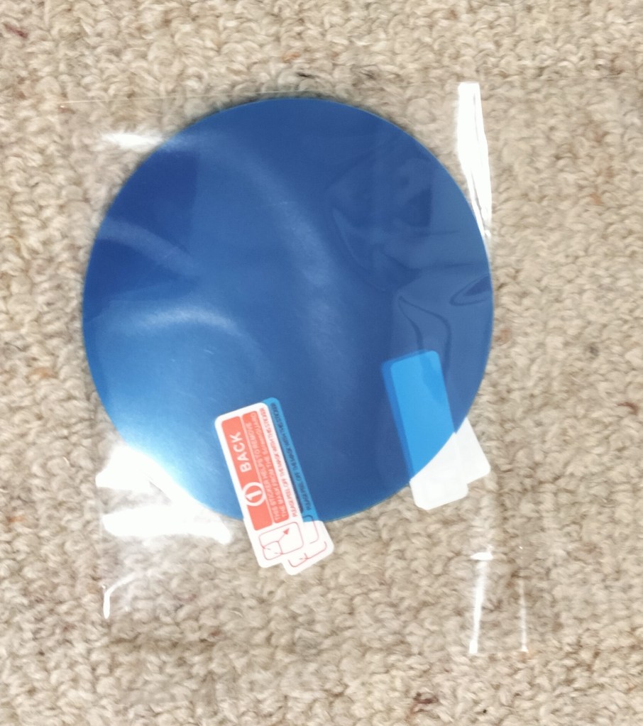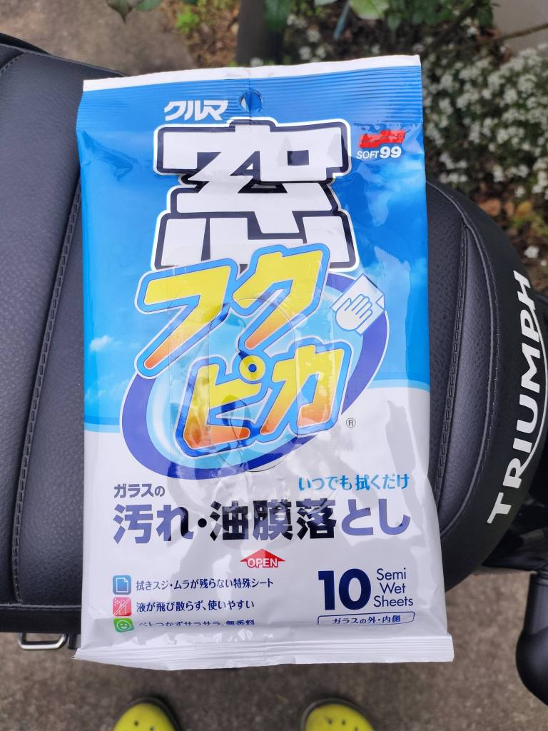 4月になり、Street Twinとのツーリングにとてもよい季節になりました。YouTubeを見ていたら本製品が紹介されていたので、雨対策として購入してみました。水滴がついてもフィルム上は視界が保たれる親水性のフィルムです。バイク用は、バイクのミラー用に丸くカットされています。フィルムは4枚入っていました。