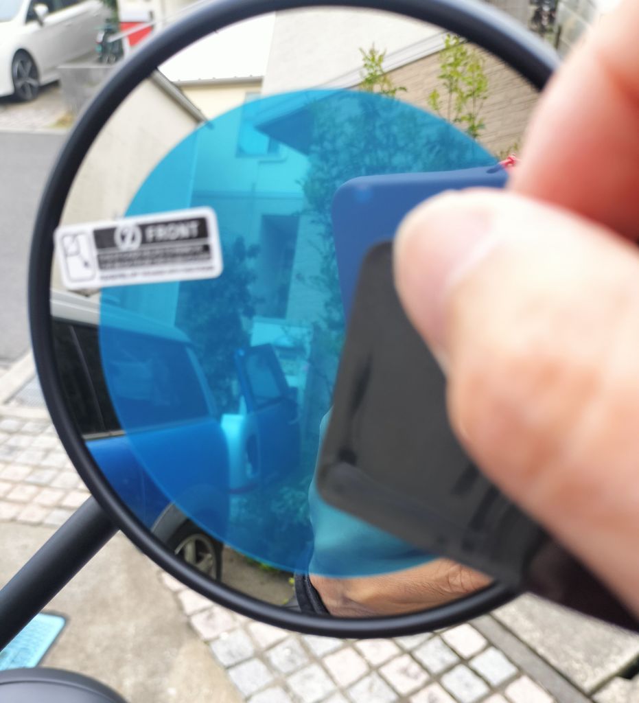 まずはミラーの汚れを取り除きます。ちょうどフクピカがあったので、フクピカで取り除きました。フィルムには表側と裏側に保護フィルムが貼ってあります。まずは裏側の保護フィルムを剥がし、ミラー中央部に貼ります。そのあと、ヘラのようなものを使って気泡を外に押し出して取り除きます。気泡を除いたら、表側の保護フィルムを剥がして完成です。ちょっと雑に貼ってしまったので、がんばったのですが気泡が残り気味です…。