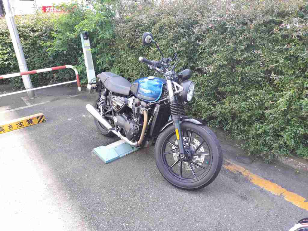 歩道にも駐輪スペースがあるのですが、他の自転車などと当たってStreet Twinにキズがつかないように、コインパーキングに駐車しました。