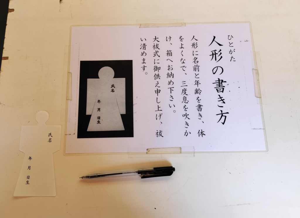早速私も芽の輪をくぐりました。左回り、右回り、左回りでくぐり、人形を書きに向かいます。人形も無料で用意されていました。自分の名前と生年月日を書き、よく撫で、息を三度吹きかけてから箱へ納めます。