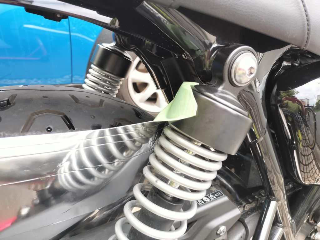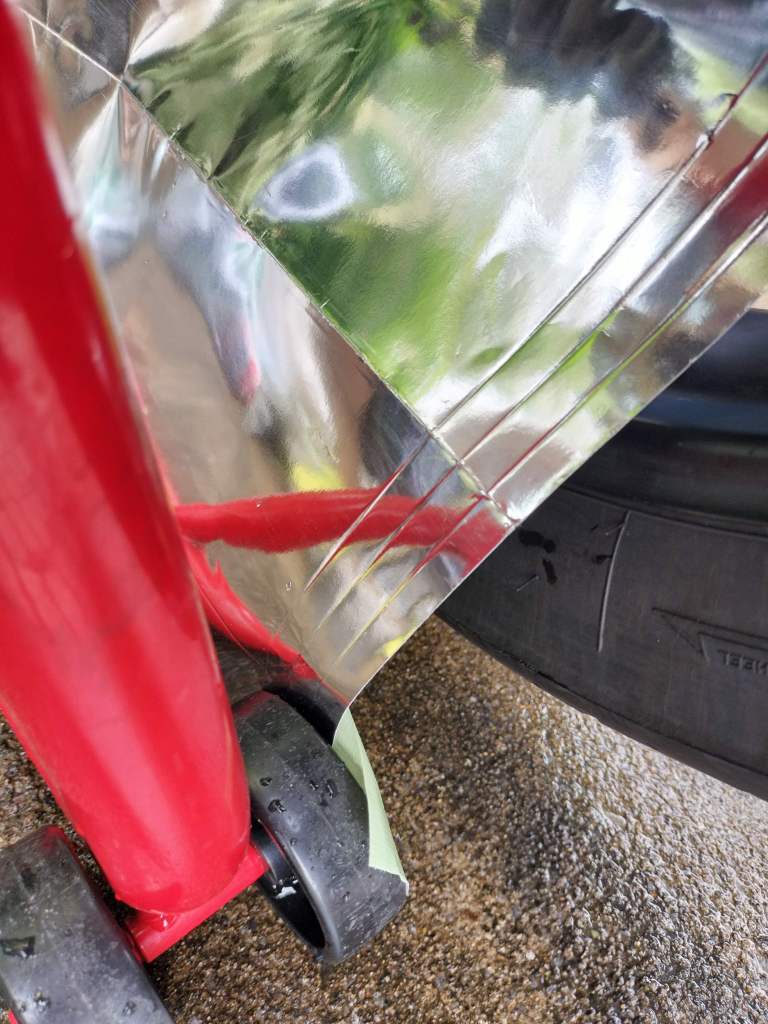養生パネルは100円ショップで買ったガス台用のシートを加工したので、紙でできています。ホイールとチェーンの間に設置することは簡単でしたが、後輪を回すと動くので、テープで固定しました。