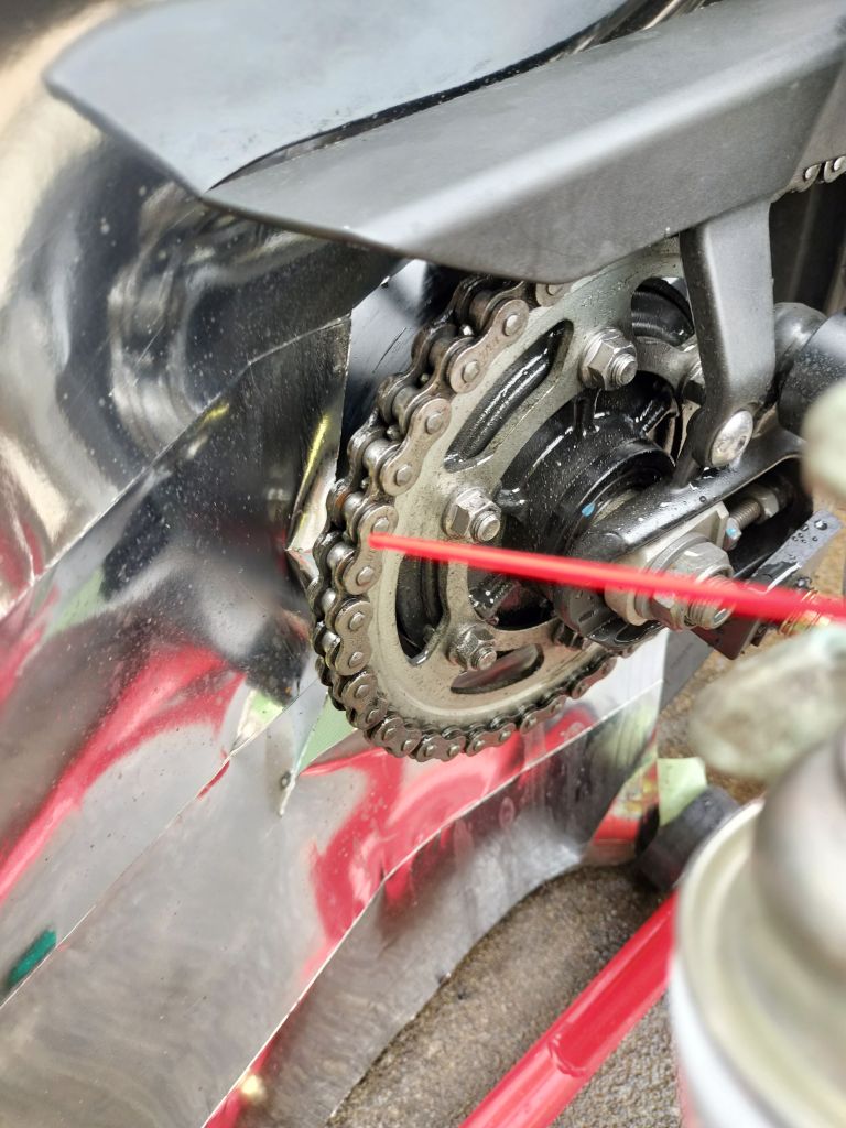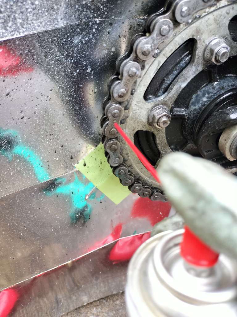 チェーンクリーナーを吹き付けます。養生パネルがあってもリヤホイールを回すことができるので、メンテナンス作業が楽に進みます。リヤホイールにクリーナーがかかる心配もありません。