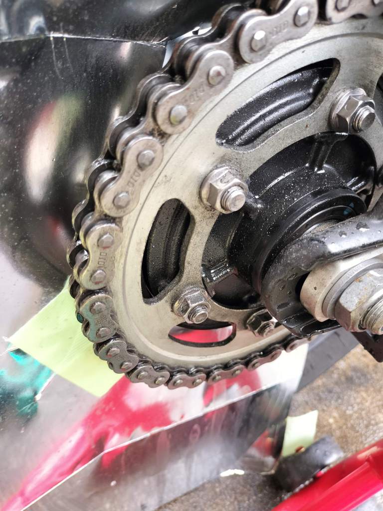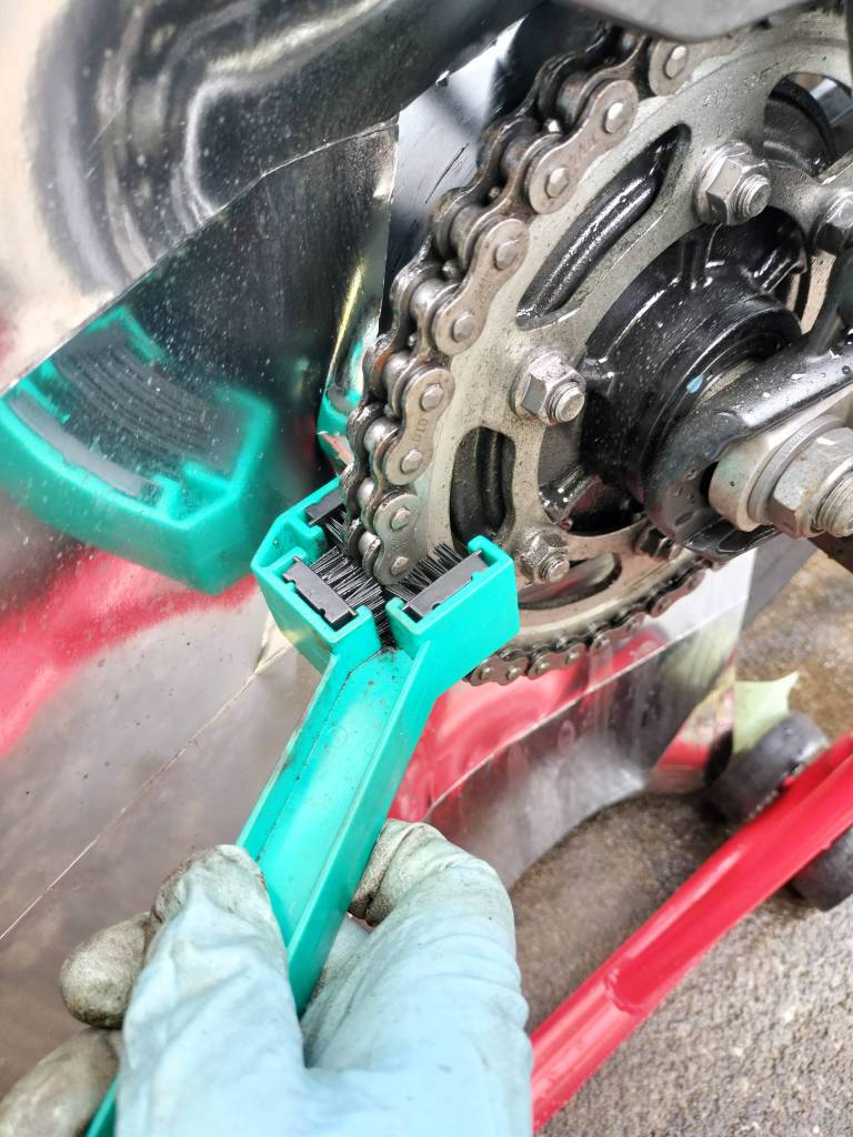チェーンクリーナーを吹き付け、ブラシで軽く汚れを搔き出し、ウエスでチェーンを拭きます。チェーンがきれいになりました。