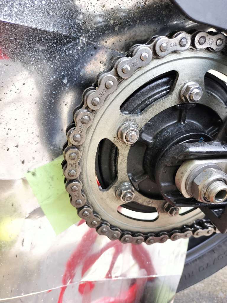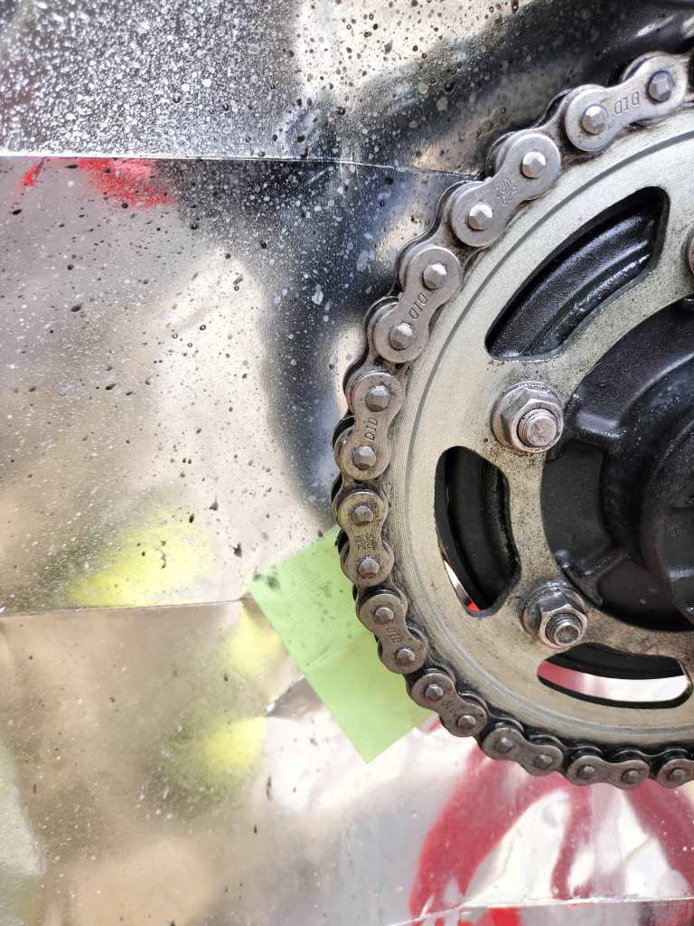 前回のチェーンメンテナンスから約500㎞くらい走行したので、Street Twinのチェーンメンテナンスを行いました。見たところ、そこそこ汚れているようです。先日作成した養生パネル?を使います。パネルによりチェーンクリーナーやチェーンルブがStreet Twinのリヤホイールに付着することを防ぐためです。