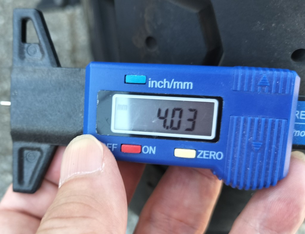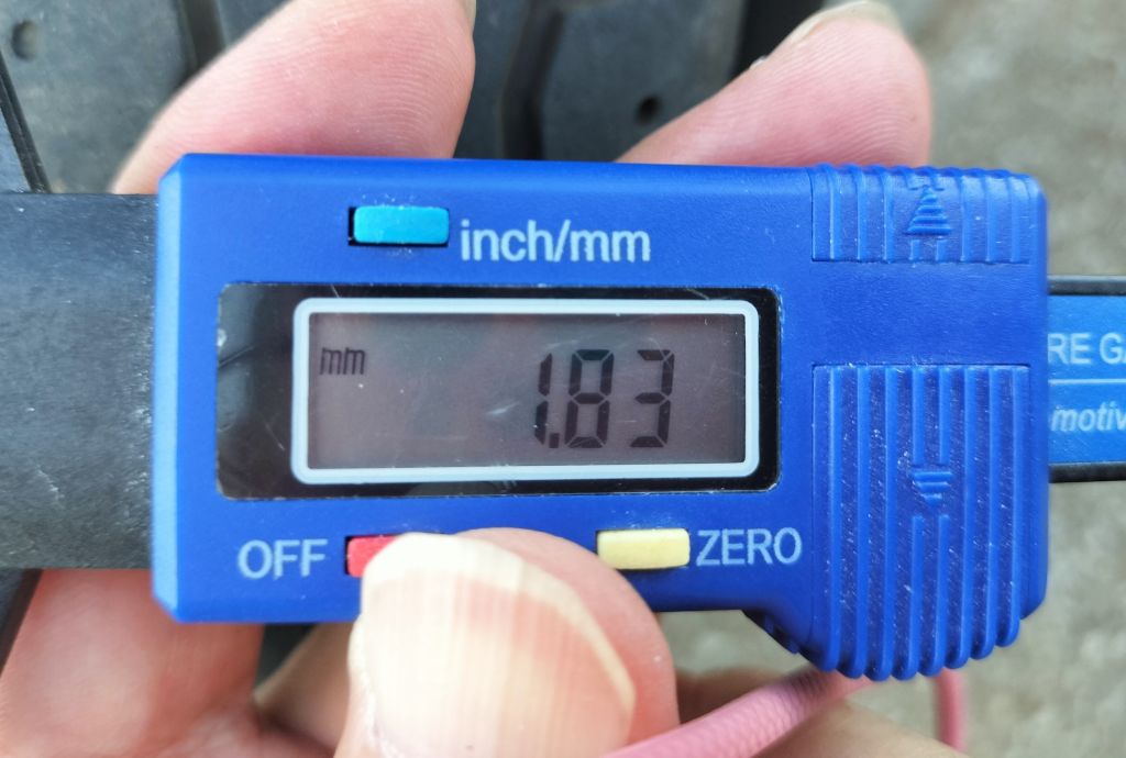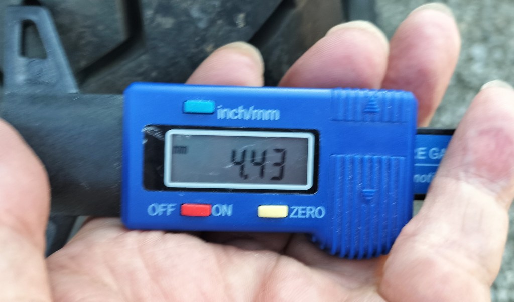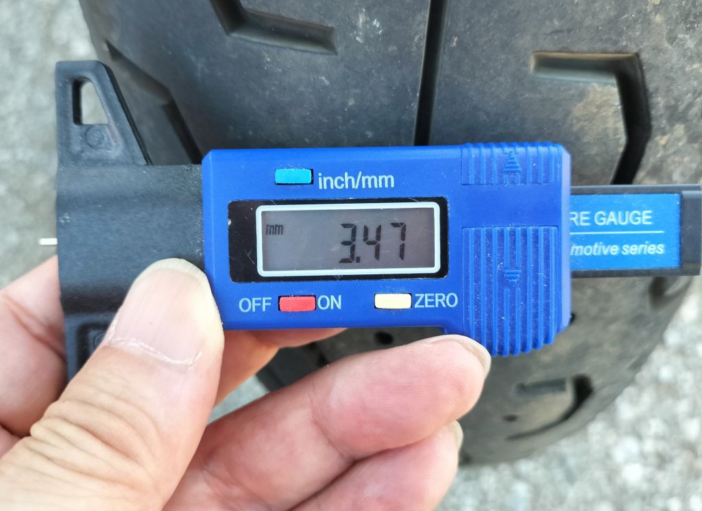 ODOMETERが5,199㎞時点の測定では、Street Twinを後ろから見て左側から4.59㎜、3.68㎜、3.96㎜でした。測った場所にもよるのかもしれませんが、後輪は左側の方が溝が残っていました。溝はそれなりに減っているようです。全体としては、Street Twinに乗車して右側の溝が減っていました。私が左右曲がるときに癖があるのでしょうかね。