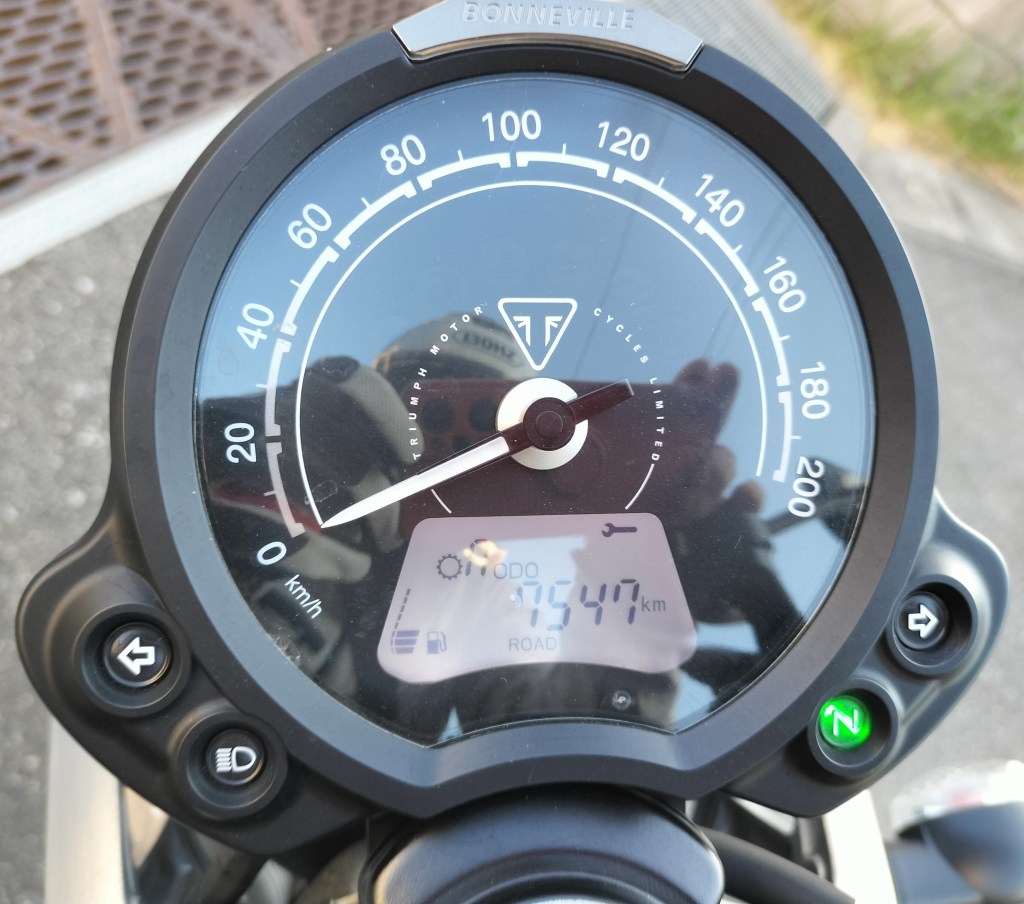 7,500㎞を超えた前輪です。さらに溝が減りました。Street Twinに向かって左側1.85㎜、中央1.07㎜、右側1.83㎜でした。確か車検に通る溝の深さが0.8㎜だったと思うので、あと500㎞も走ったらそのくらいになりそうです。