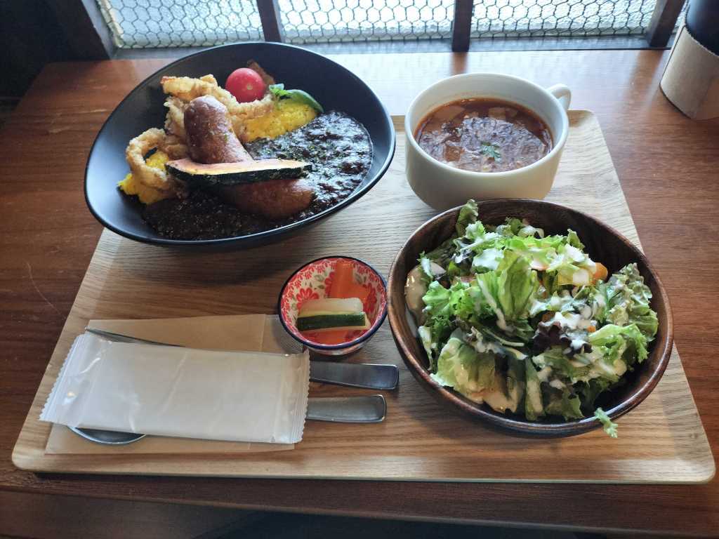 せっかくなのでカフェの中に入りました。どうやらおすすめの一つがカレーのようです。さっきちゃんぽんを食べたばかりだったのですが、カレーが好きなので、つい注文してしまいました。画像のように大きなソーセージなども入っており、とても美味しいカレーでした。