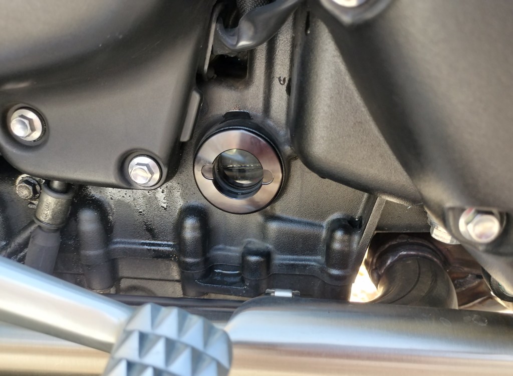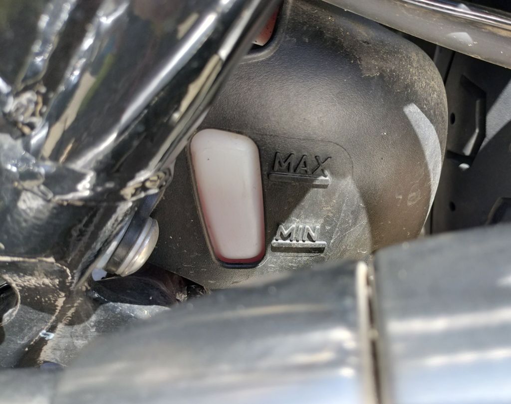フロントホイールクランプとメンテナンススタンドで車体を垂直にしたので、エンジンオイルと冷却水の量を確認してみました。エンジンオイルは適量入っているようです。冷却水はほぼMaxの量が入っているようです。