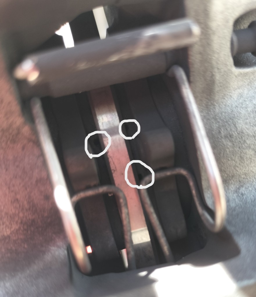 ブレーキパッドの残量を確認しました。画像は前輪です。パッドにある溝が小さくなると交換時期のようなのですが、これまではどこに溝があるのか分かりませんでした。撮影した画像をよく見ると、白い丸のところにあるようです。何ミリかわかりませんが、残量は心配なさそうです。