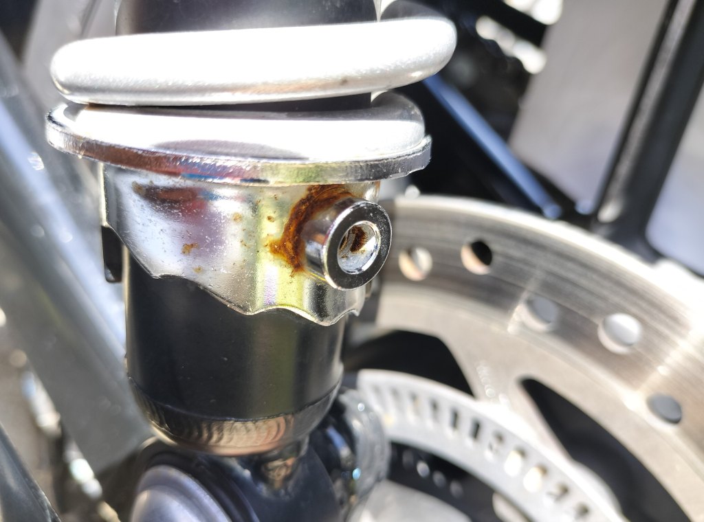 ひとつ気になるのは、錆です。後輪左側のダンバー部分です。前にも1回錆が出たので、除去した部分です。右側はなにもなっていないようなのですが…。そのほかの部分は錆はなさそうです。