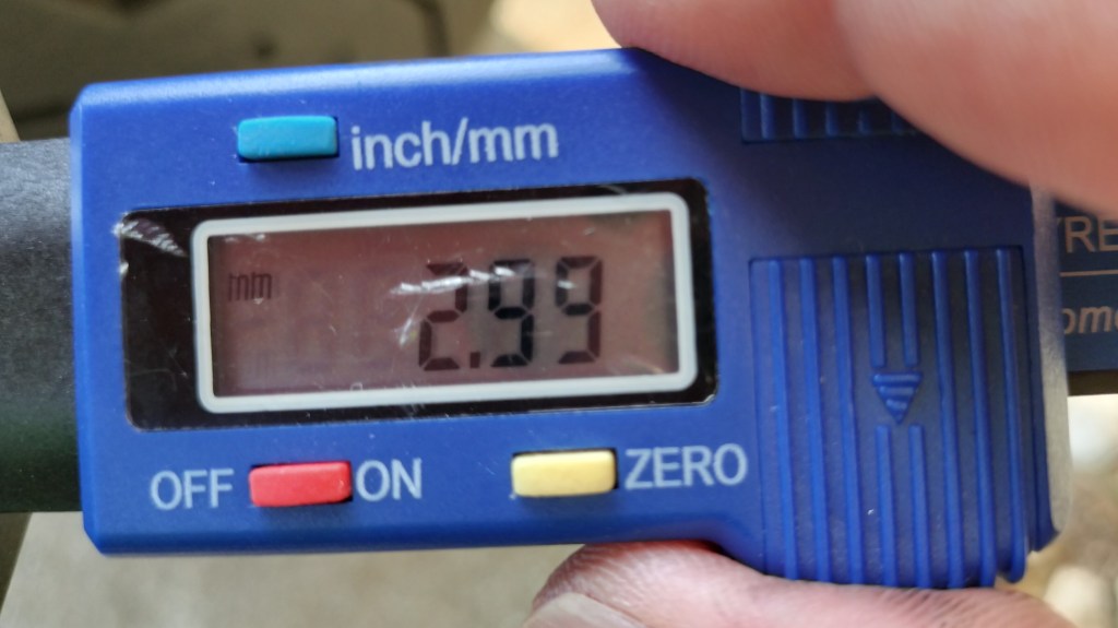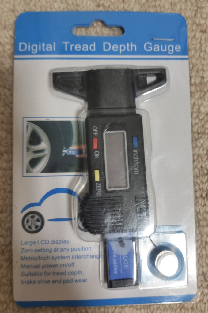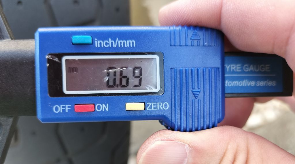 実はこれまで使っていたDepth Gaugeには、少し違和感を感じていました。このDepth Gaugeは画像上部に針のようなものが出るようになっていて、それがゼロからどのくらい飛び出るとタイヤ溝の底面に達するかを測るものです。これまでのものは、もともとちょっと飛び出ていて、「これで本当に大丈夫かな…」と思っていながら使用していました。そのため、数値より目視では溝が深く見えていたので、「本当かなあ」と思いながら使っていました。