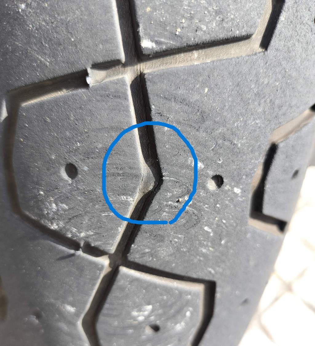 上の画像は前輪のスリップサインと思われる場所です。もうそろそろスリップサインに差し掛かるところのようです。スリップサインの左右にある丸いポッチは、場所によってはほぼ深さがなくなりつつあるところも出てきました。あと500~1,000㎞走るとスリップサインが出てきそうです。またレポートしたいと思います。