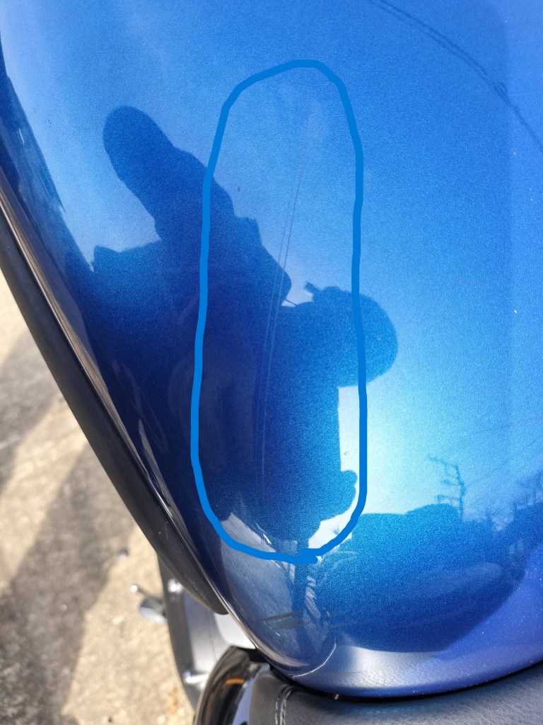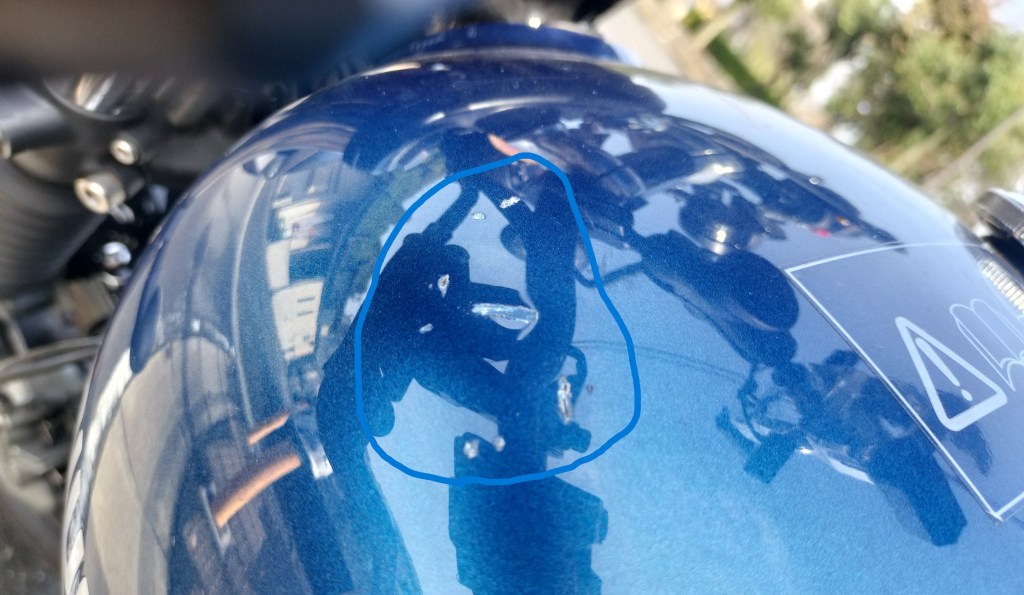 ただ、Street Twinには修理が必要になってしまいました。上の画像はタンクに作ってしまった傷です。ひっかいたというよりは、衝撃でタンクの塗装が欠けたような感じです。幸いタンクに凹みなどはないようです。