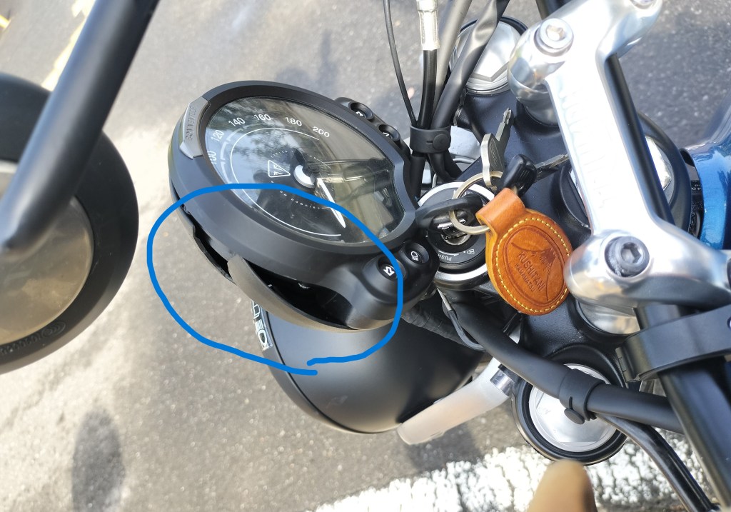 転倒後、私は足がバイクの下から抜けなかったので、通りかかった親切な2名の方の力を借りてStreet Twinを起こしました。保険会社に連絡し、レッカーを呼んで待っている間に車体を確認しました。スピードメーターのプラスチック製カバーが壊れています。タンクは凹んでないようですが、左側のバックミラーが折れています。左に倒れたので、ギアのチェンジレバーが曲がっています。
