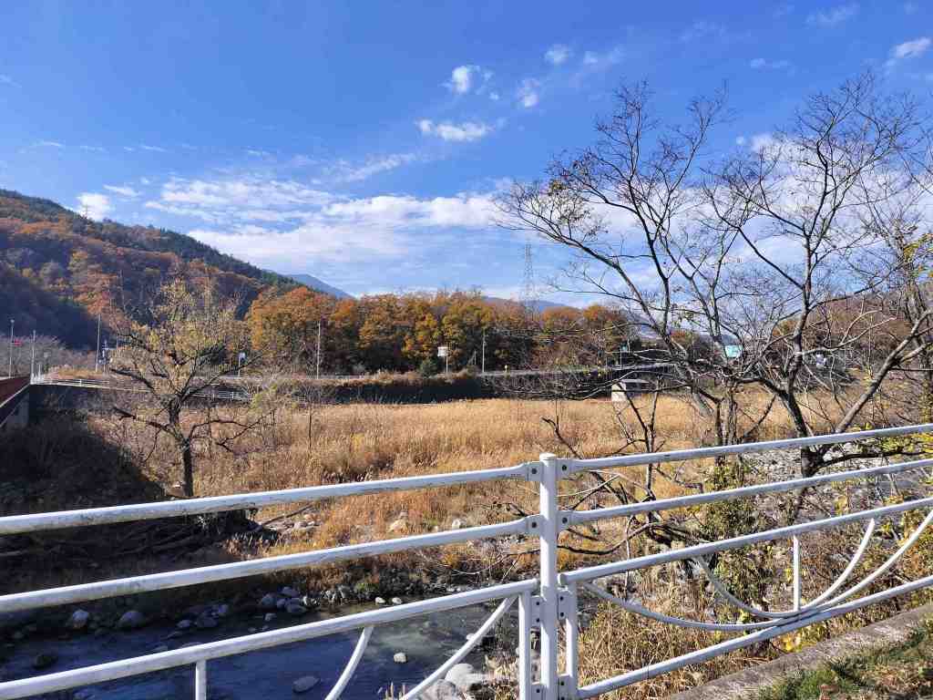 友人と合流する北杜市へ向かう途中の風景です。この日は友人と合流し、宿へ向かうまでがツーリングでした。紅葉していますが、もうそろそろ終わりでしょうかね。都心部に比べると空気が冷たいです。甲府市から北杜市へ向かうにつれ標高が上がるので、空気はさらに冷たくなります。でも、天気に恵まれたので、初日からとても気持ちいいツーリングになりました。