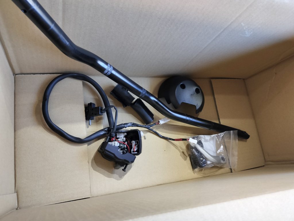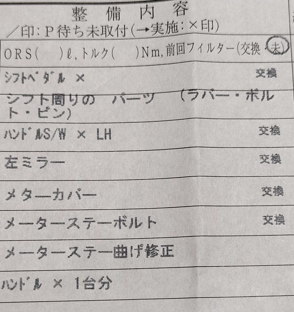 修理のため発注した部品は上記の画像のとおりです。当初の見積もりのときと変更ありません。メーターステーは納期がはっきりしなかったので、赤男爵のメカニックの方に曲げなおして頂くことで修理して頂きました。修理で外した部品を見せて頂きました。「壊してしまってごめんねー」と反省です。