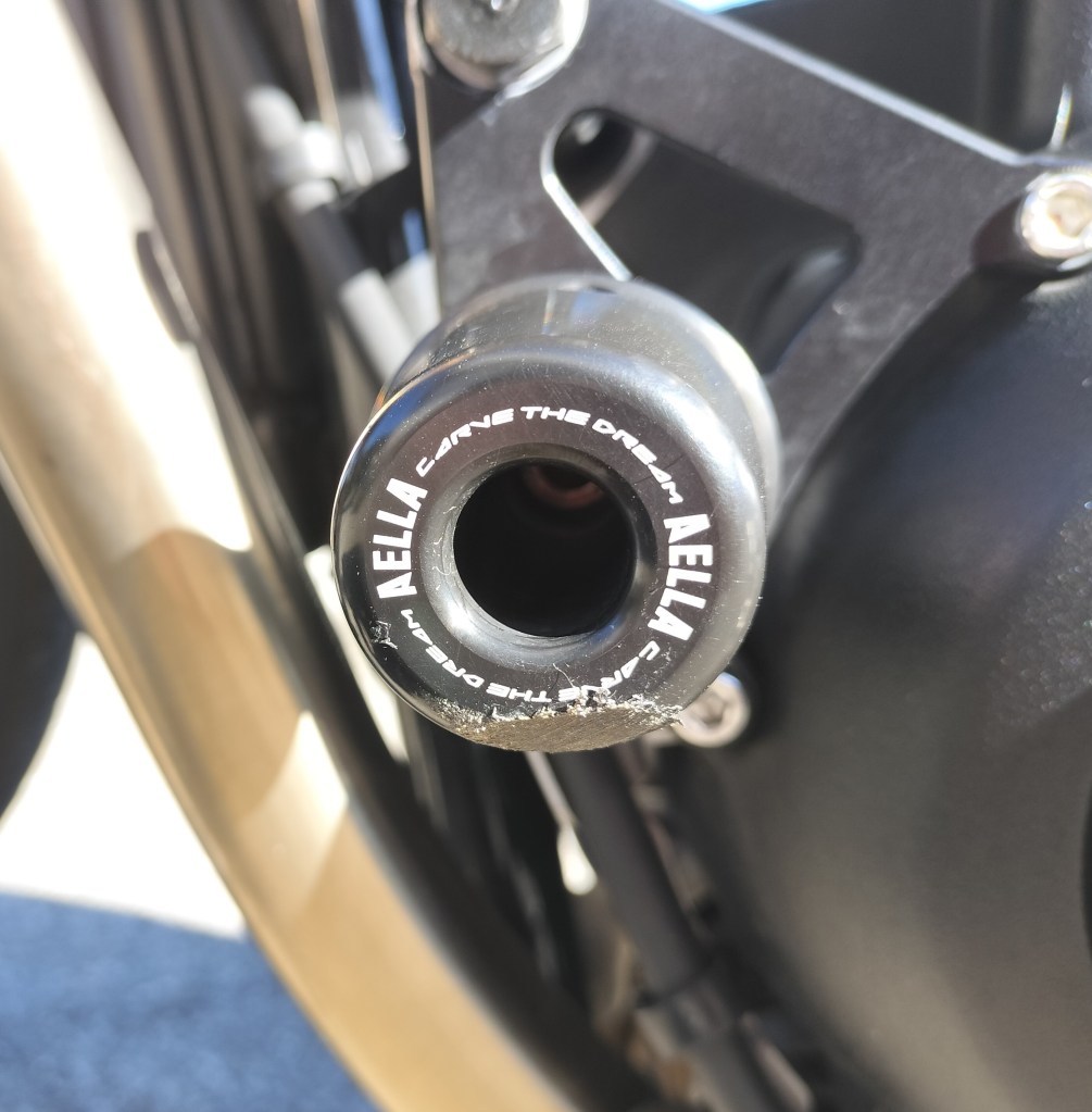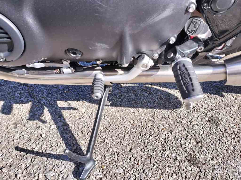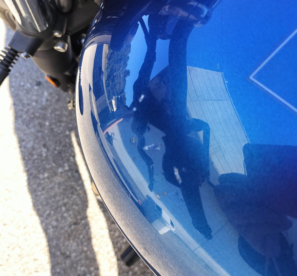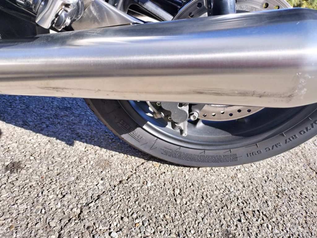 転倒当日、自宅を出るときにバーロックをリヤタイヤに付けたまま発進したときの立ちごけによるダメージを改めて確認しました。メカニックの方が少し磨いてくれたようですが、ウェストバッグによると思われるタンクの傷はうっすら残りました。バーロックが当たったと思われる部分を目視してみたのですが、傷らしいものは見つからず、ほっとしています。