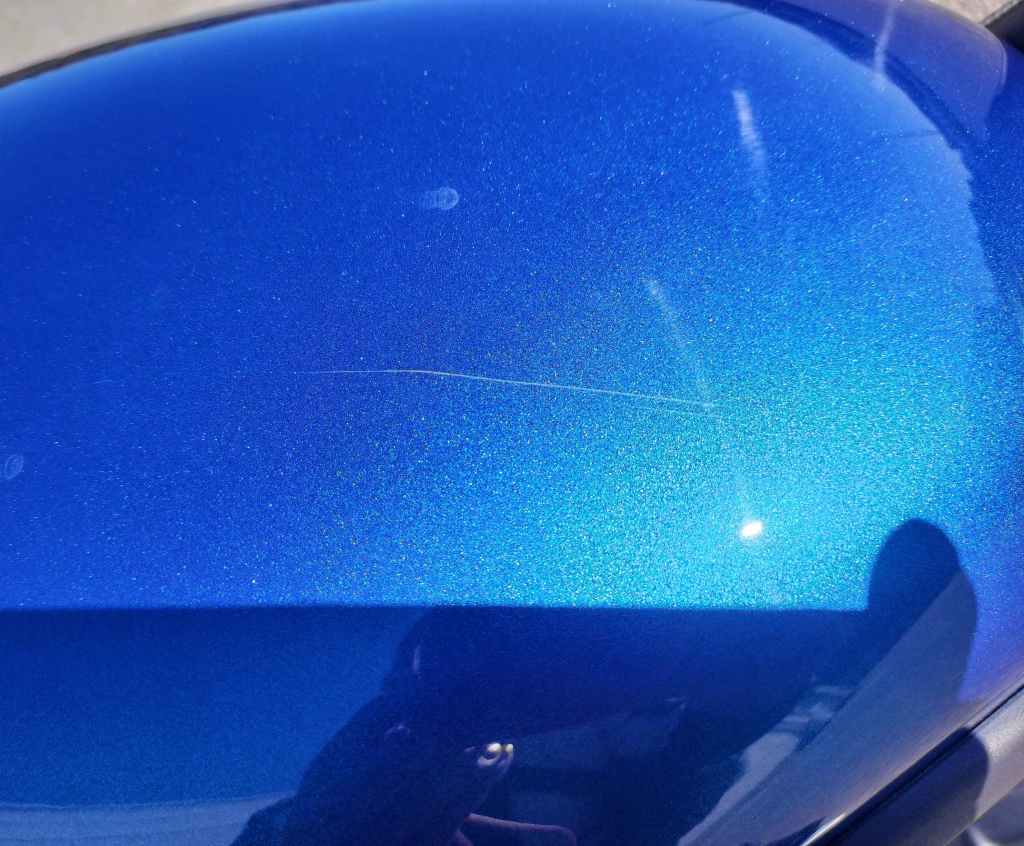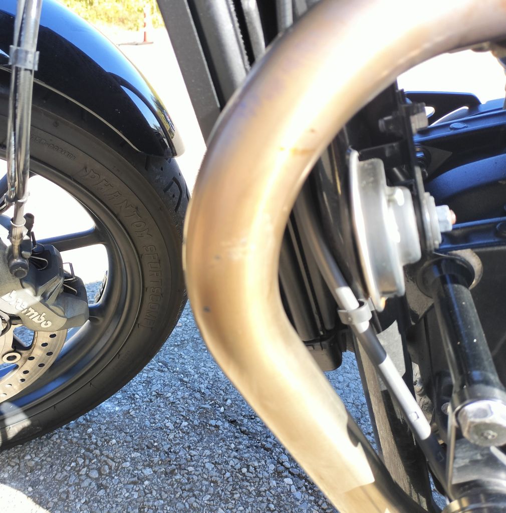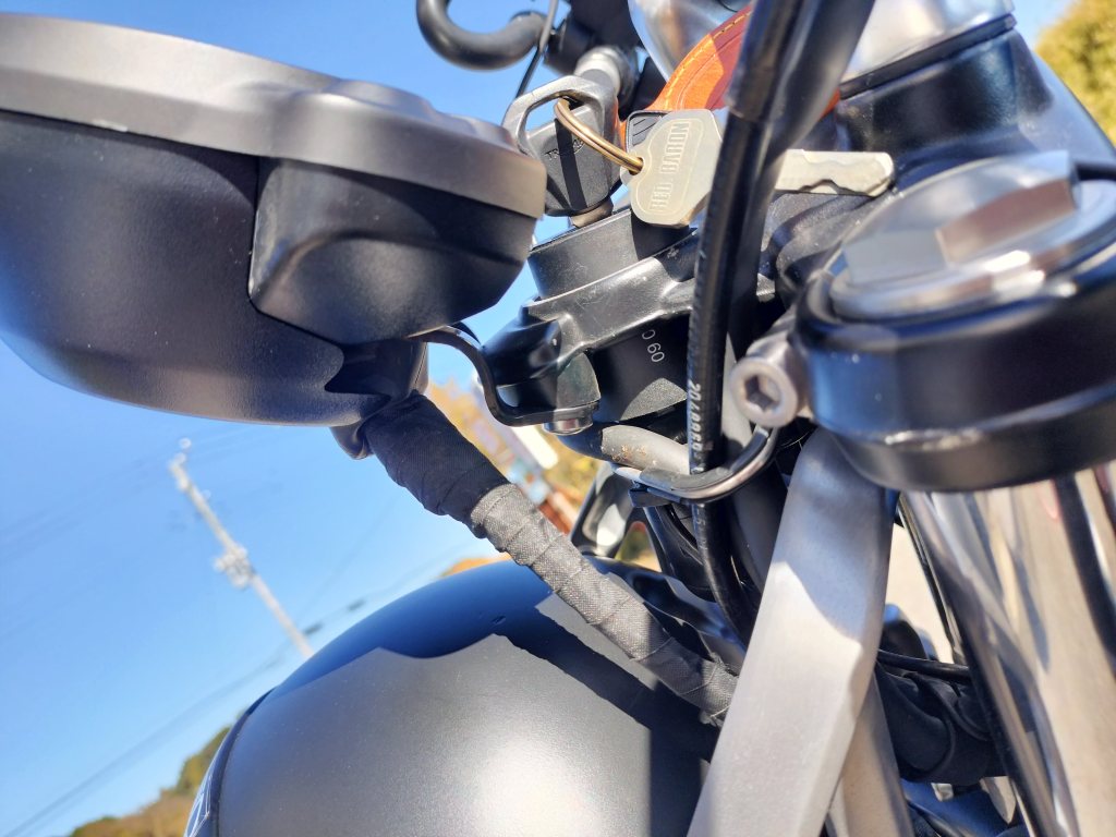 転倒当日、自宅を出るときにバーロックをリヤタイヤに付けたまま発進したときの立ちごけによるダメージを改めて確認しました。メカニックの方が少し磨いてくれたようですが、ウェストバッグによると思われるタンクの傷はうっすら残りました。バーロックが当たったと思われる部分を目視してみたのですが、傷らしいものは見つからず、ほっとしています。