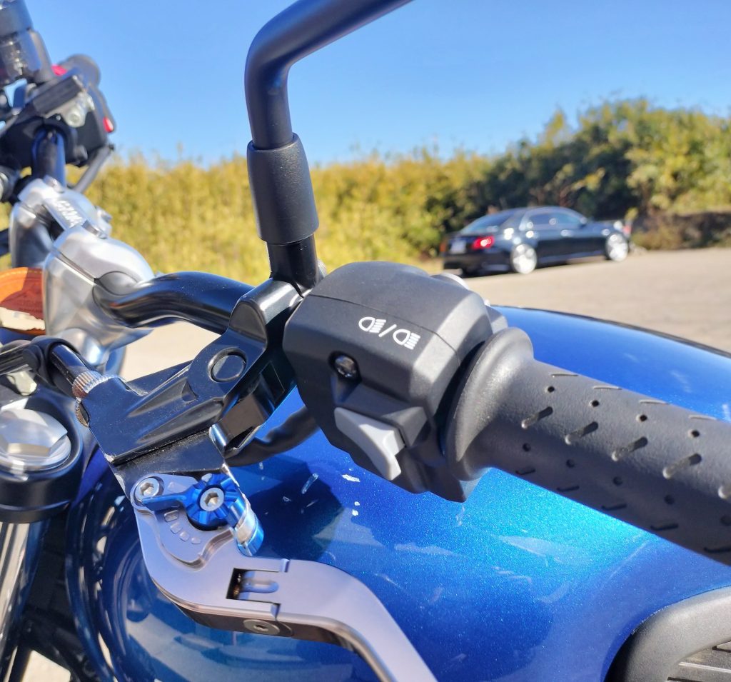 修理から帰ってきたStreet Twinの外観を観察しました。メーターカバーは新品なのできれいです。メーターステーは曲げなおして修理したのですが、曲げすぎると折れてしまうので、メーターは少し立った感じになりました。ちょっとキーの出し入れが窮屈ですが、許容範囲です。クラッチ側のバックミラーやスイッチは新品になりました。スイッチの機能は失われていなかったのですが、ケースが割れてしまったので雨水などが入ることが想定されたため新品にしました。タンクは塗装が欠けただけかと思っていましたが、軽くエクボになっていました。エキマニやマフラーも左側は少しキズが入りました。そんなに目立つ感じはないです。左側のエンジンスライダーは転倒時に削れてしまいましたが、削れた部分を下に向けて目立たないようにしてくれました。赤男爵のメカニックさんの配慮に感謝です。